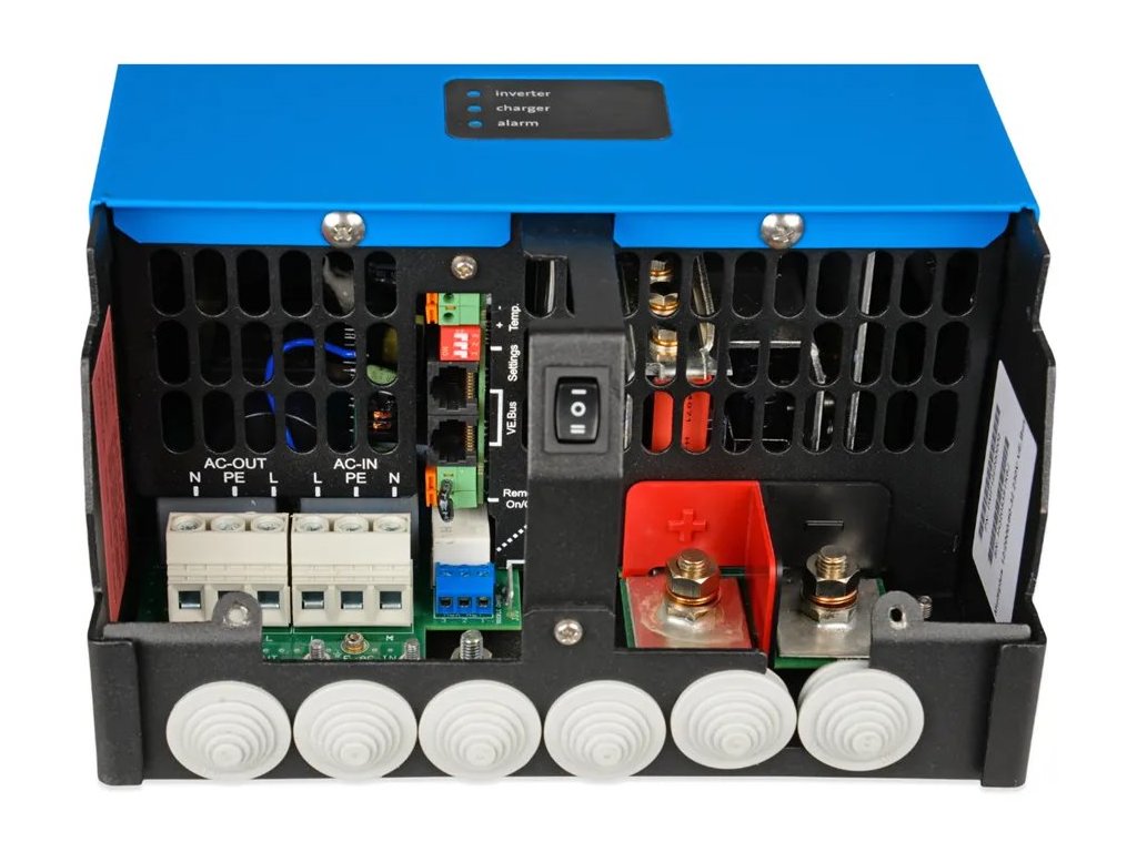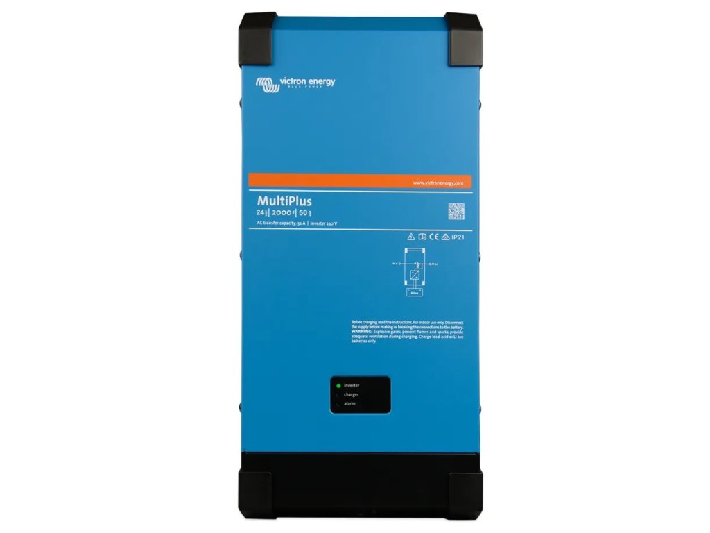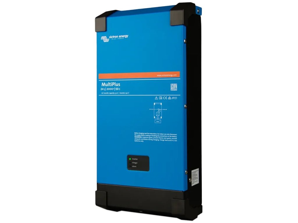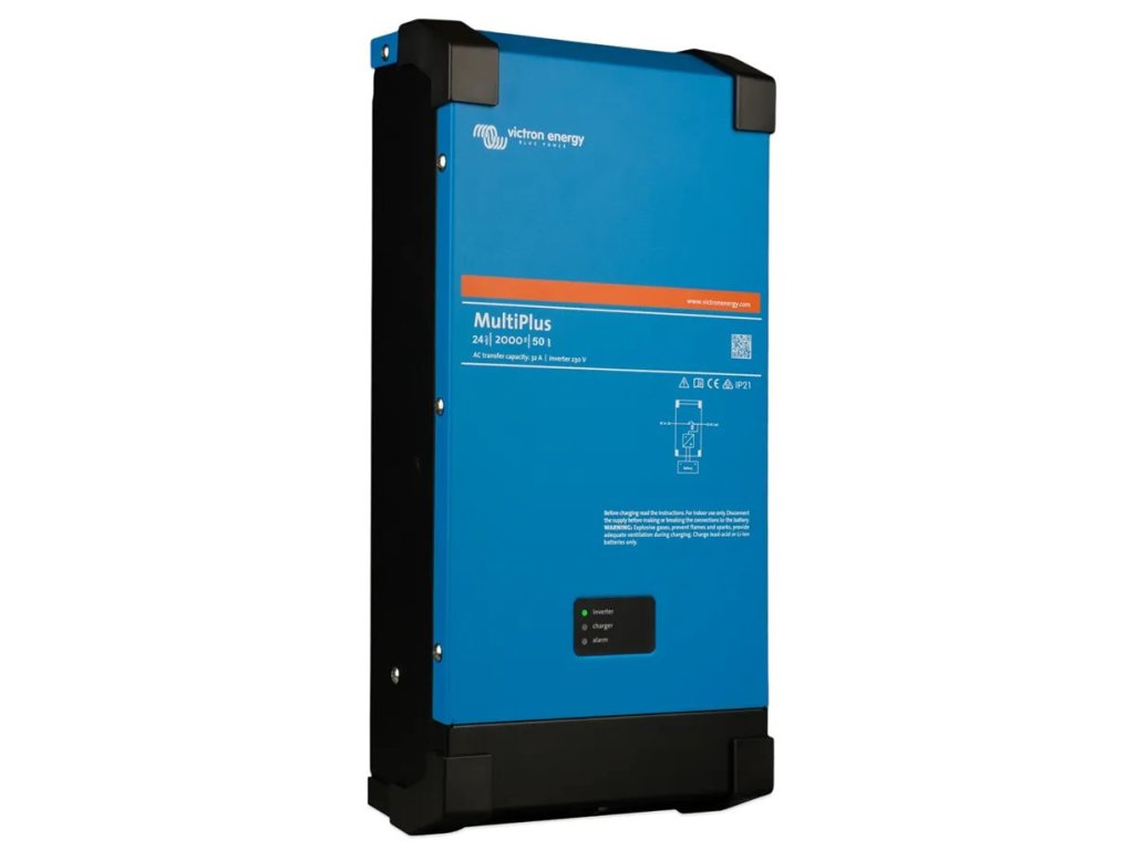 Victron MultiPlus 24 V/2000 VAMultiplus je výkonný DC-AC hybridní měnič/nabíječ s čistě sinusovým výstupem, s integrovanou adaptivní nabíječkou baterií a ultra rychlým transferovým přepínačem zdroje napájení (baterie - externí AC zdroj). Střídač je umístěn v plastovém kompaktním krytu v atraktivním designu.