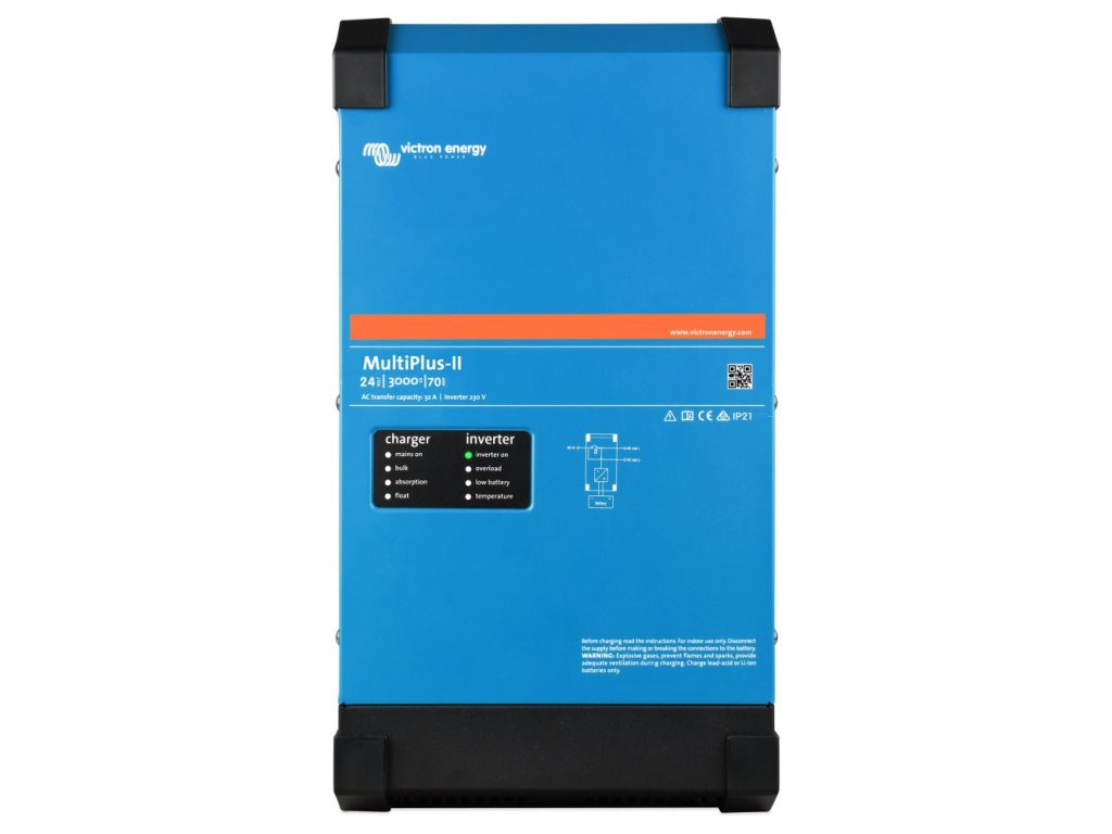 Victron MultiPlus-II 24V/3000VA/70A-32AMultiPlus-II je výkonný DC-AC hybridní měnič/nabíječ s čistě sinusovým výstupem, integrovanou adaptivní nabíječkou baterií a ultra rychlým transferovým přepínačem zdroje napájení - baterie/zdroj (externí AC).