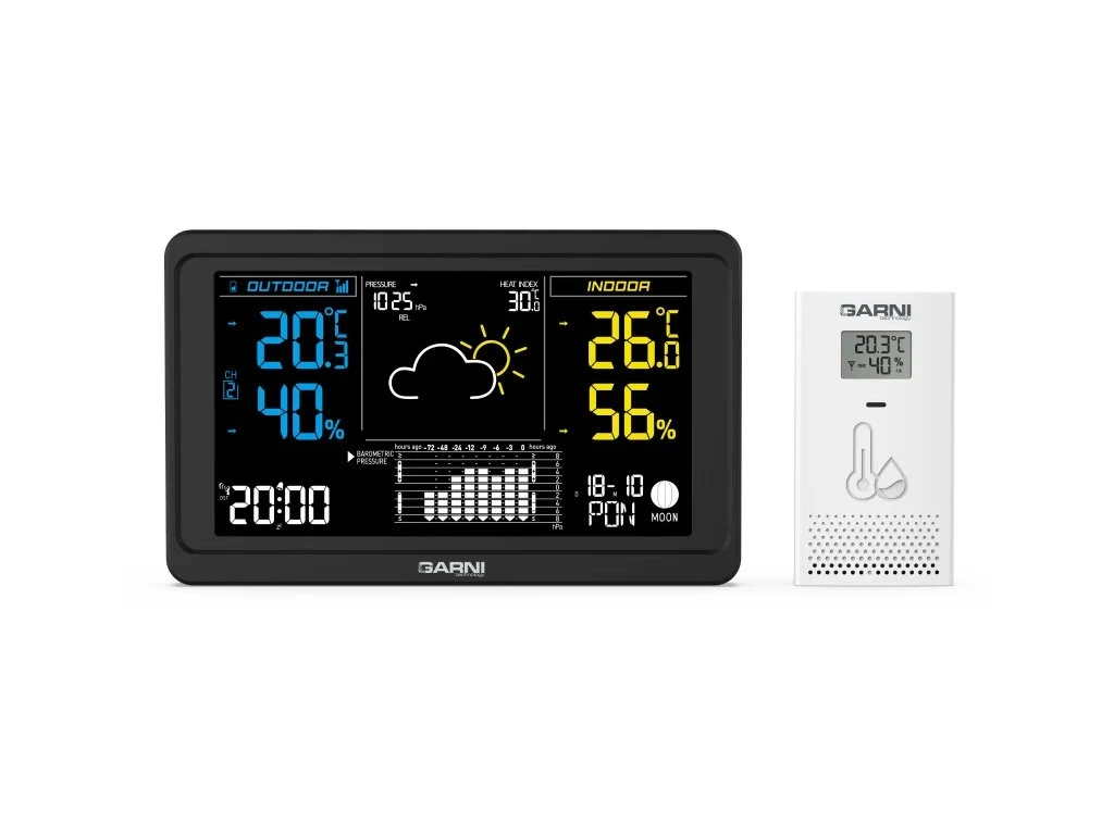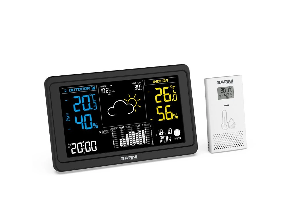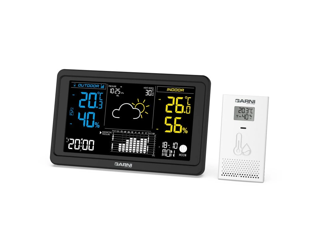 Přesná meteorologická stanice s inverzním barevným VA displejem s časem a datem řízenými rádiovým signálem DCF-77, budíkem, měřením vnitřní teploty, relativní vlhkosti, barometrického tlaku a bezdrátovým čidlem pro měření vnější teploty a relativní vlhkosti. Pro dosažení vysoké přesnosti měření teploty a relativní vlhkosti jsou použita špičková čidla švýcarské značky SENSIRIONinverzní barevný VA displej o rozměrech 169 x 95 mm s možností stálého osvětlení při napájení síťovým adaptérem, nebo krátkodobým osvětlením na 10 s při napájení bateriemi