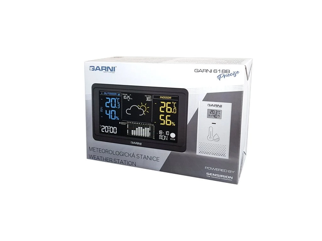 1 x hlavní jednotka GARNI 618B Precise 1 x bezdrátové čidlo GARNI 063H 1 x síťový adaptér český, slovenský, anglický, německý, nizozemský, polský a maďarský návod
