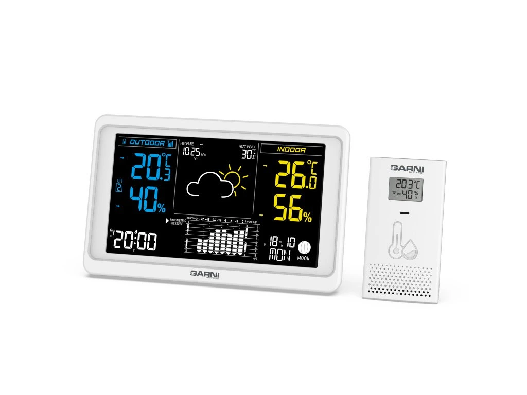 Přesná meteorologická stanice s inverzním barevným VA displejem s časem a datem řízenými rádiovým signálem DCF-77, budíkem, měřením vnitřní teploty, relativní vlhkosti, barometrického tlaku a bezdrátovým čidlem pro měření vnější teploty a relativní vlhkosti. Pro dosažení vysoké přesnosti měření teploty a relativní vlhkosti jsou použita špičková čidla švýcarské značky SENSIRIONinverzní barevný VA displej o rozměrech 169 x 95 mm s možností stálého osvětlení při napájení síťovým adaptérem, nebo krátkodobým osvětlením na 10 s při napájení bateriemi