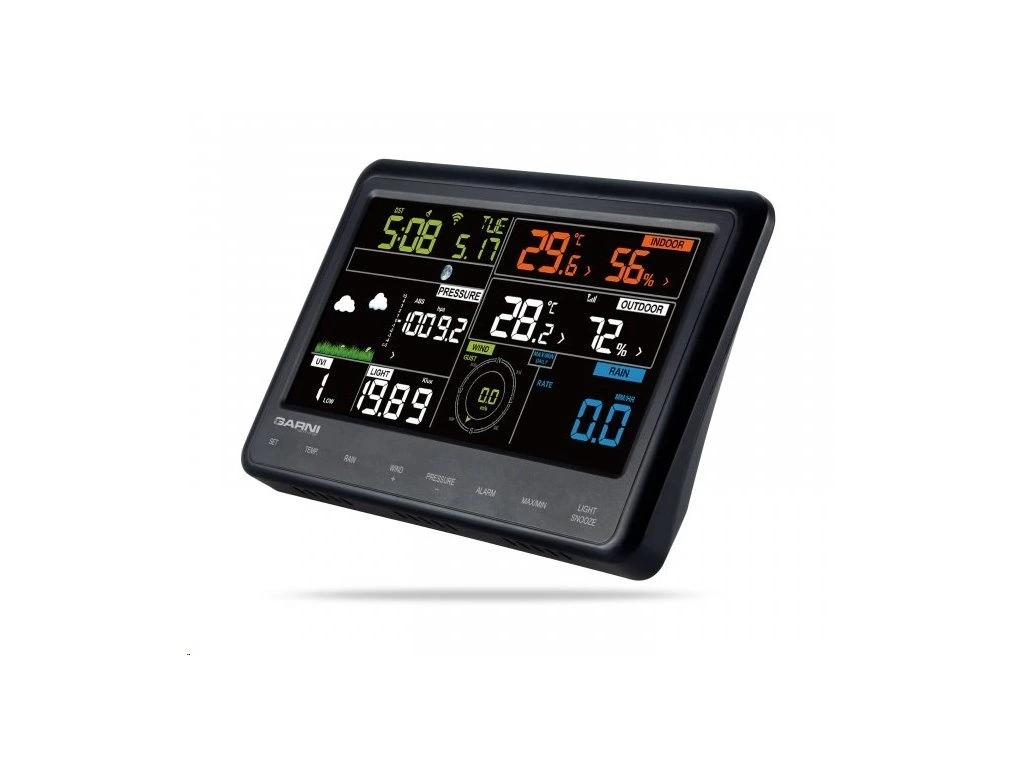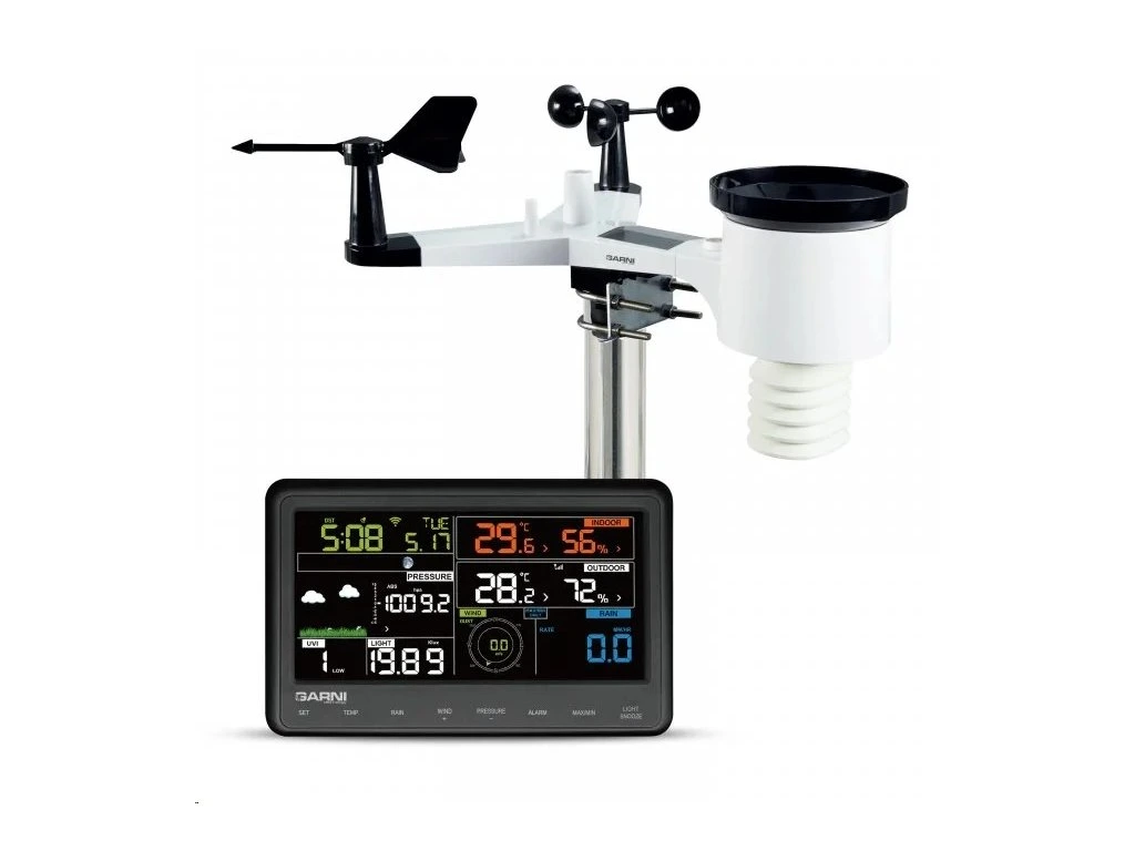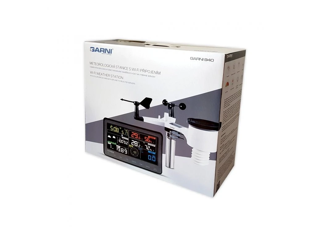 Wi-Fi meteorologická stanice s integrovaným bezdrátovým čidlem model GARNI 940 je vybavena mnoha funkcemi, zajišťujícími informace o předpovědi počasí. Integrované bezdrátové čidlo pracuje na frekvenci 868 MHz a měří teplotu a relativní vlhkost, rychlost a směr větru, úhrn srážek, UV záření a intenzitu osvětlení.Hlavní jednotka má snadno čitelný barevný inverzní displej, který zobrazuje předpověď počasí, vnitřní a venkovní teplotu a relativní vlhkost, hodnotu barometrického tlaku, srážek, rychlost a směr větru, UV index, hodnotu intenzity osvětlení, čas a datum, hodnotu rosného bodu, Wind Chill a teplotního indexu.