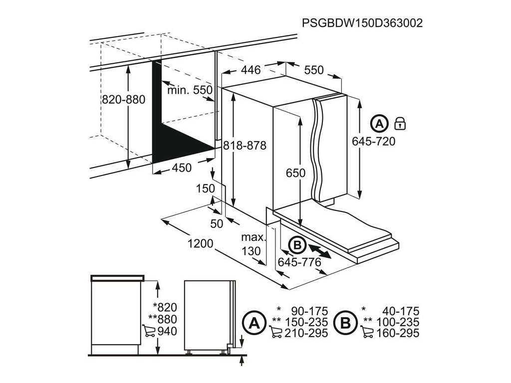 Třída energetické účinnosti: DTřída emisí hluku šířeného vzduchem: BÚroveň emisí hluku šířeného vzduchem (dB(A) re 1pW): 44Spotřeba energie na 100 cyklů (kWh): 67Jmenovitá kapacita (sad nádobí): 10Spotřeba vody na cyklus (lit.): 9.9Trvání programu (h:min): 4:00Pohotovostní režim (W): 0.5Index energetické účinnosti: 49.9Instalace: Vestavná, plně integrovaná (skrytý ovládací panel)Rozměry (mm): 818x446x550Prostor pro instalaci VxŠxH (mm): 820-900x450x550Délka přívodního kabelu (m): 1.5Délka napouštěcí hadice (cm): 150Programy: 160 minutový, 60 minutový, 90 minutový, AutoSense, eco, Machine Care, rychlý 30 minutový, Opláchnutí a čekáníDélka vypouštěcí hadice (cm): 150Příkon (W): 1550-2200Napájecí napětí (V): 200-240Požad. jištění (A): 10