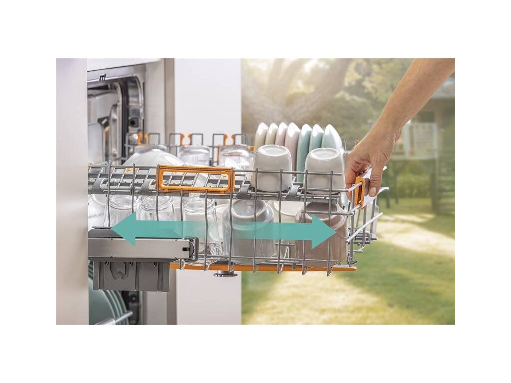 Manipulace s nádobím je rychlá a snadná díky hornímu koši, který se hladce pohybuje na vodicích kolejnicích s kuličkovými ložisky. Plně flexibilní vnitřek navíc výrazně usnadňuje vkládání i vyndávání nádobí, čímž šetří váš čas i energii.