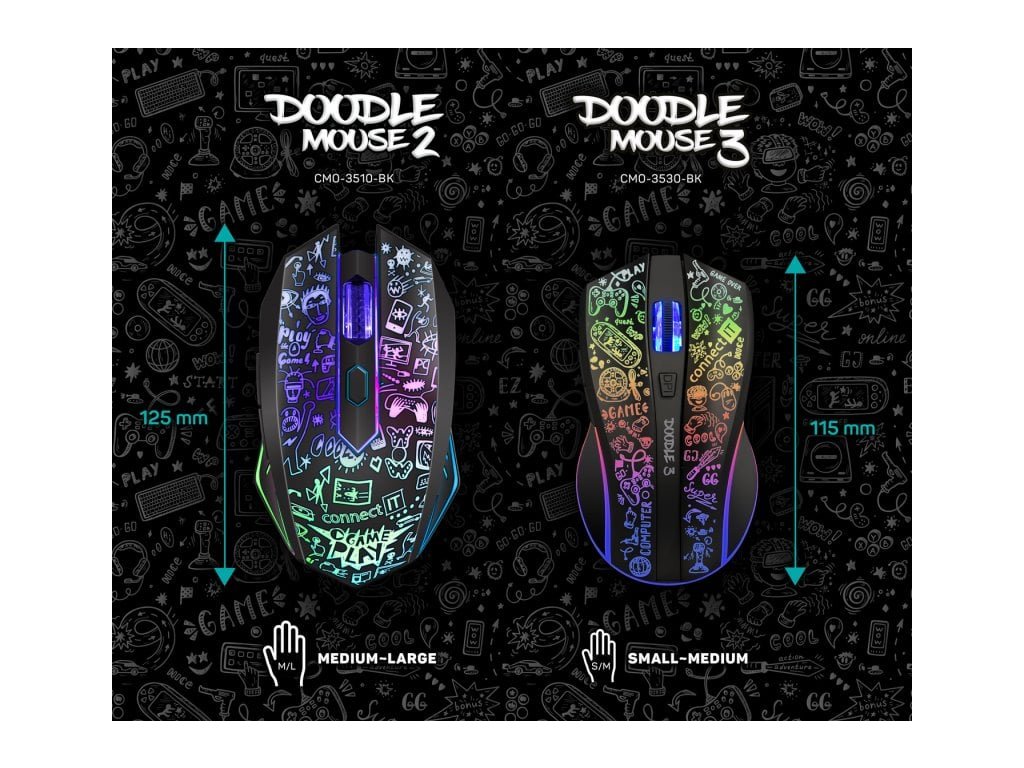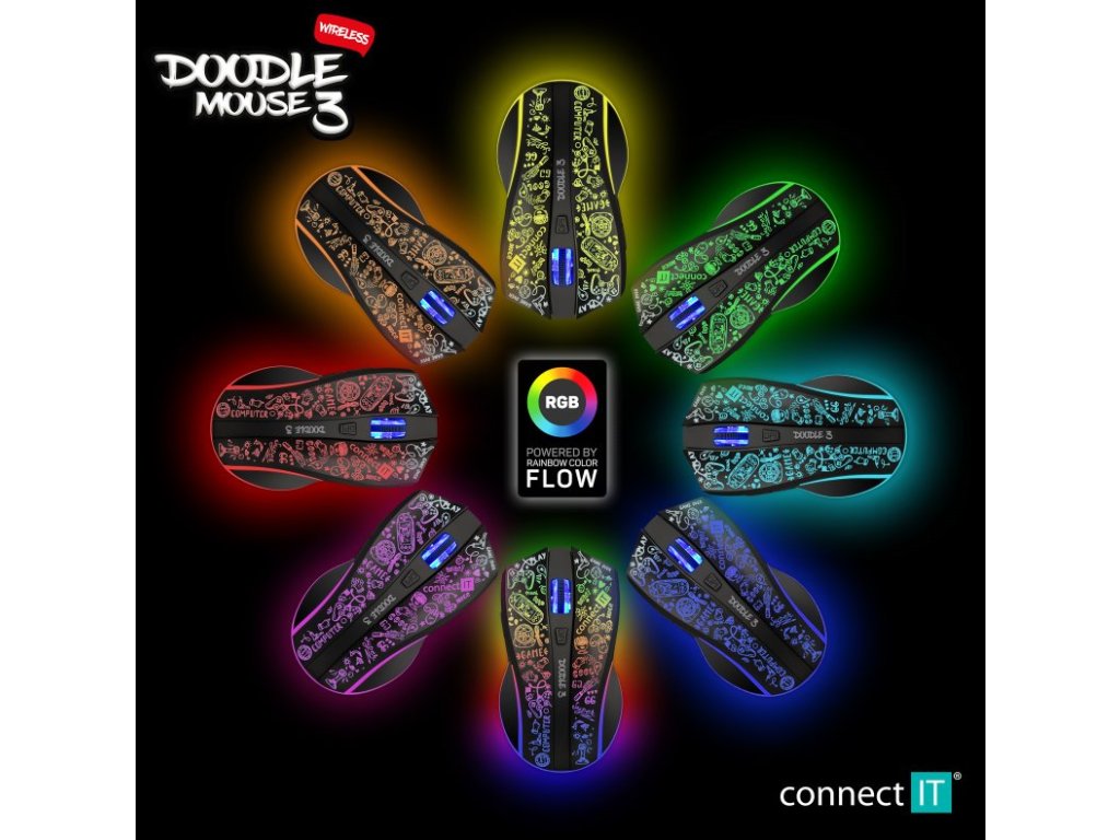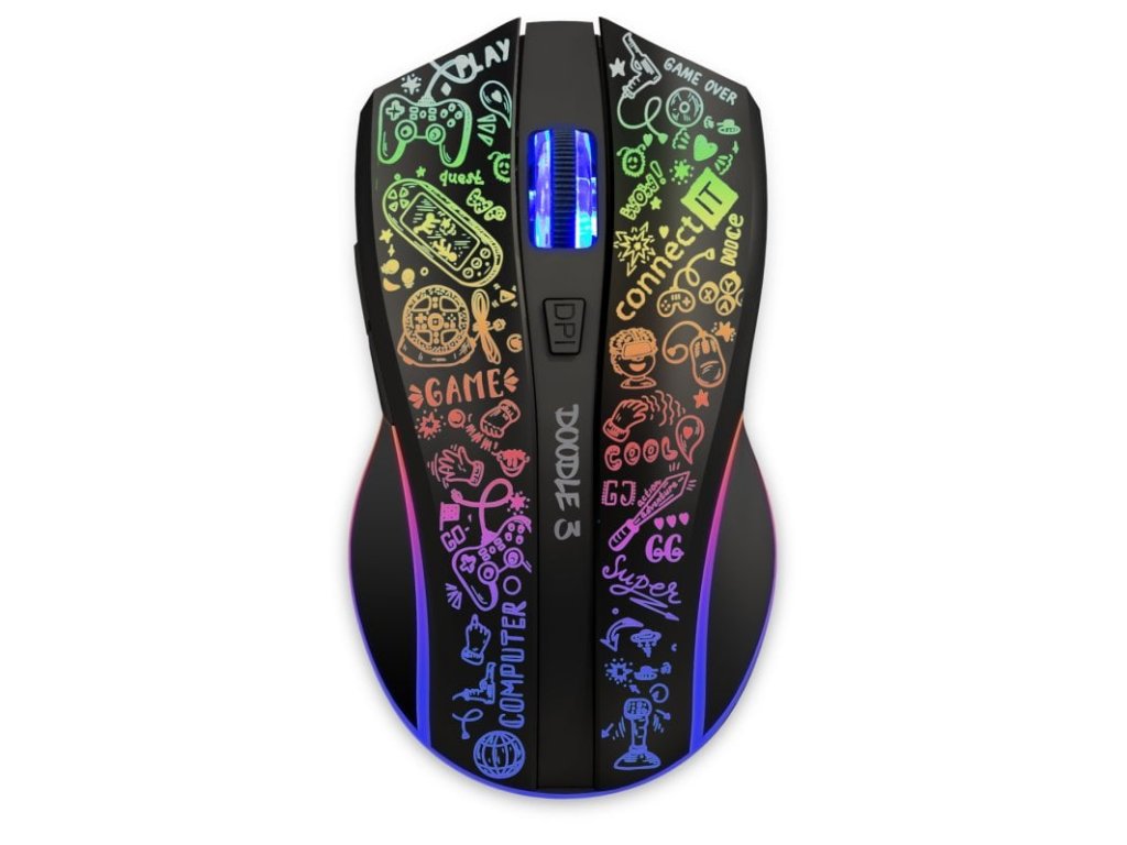 Profesionální bezdrátová gamingová myš DOODLE 3 pro hráče počítačových her s Rainbow podsvícením těla i kolečka v mixu 7 barev. Dodávaný SW s četnými nastaveními podporuje uživatelská makra, 5 uživatelských profilů a 6 programovatelných tlačítek včetně posuvného kolečka. Precizní optický senzor má nastavitelnou citlivost až na 4800 DPI.