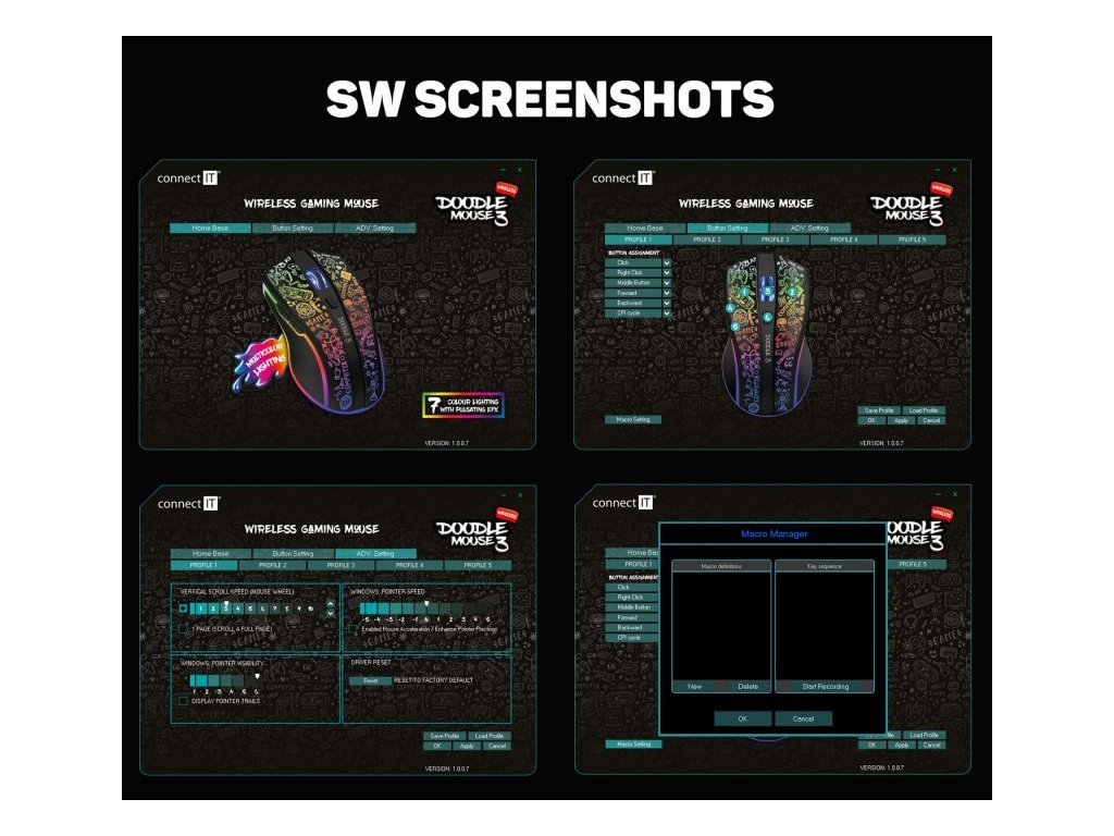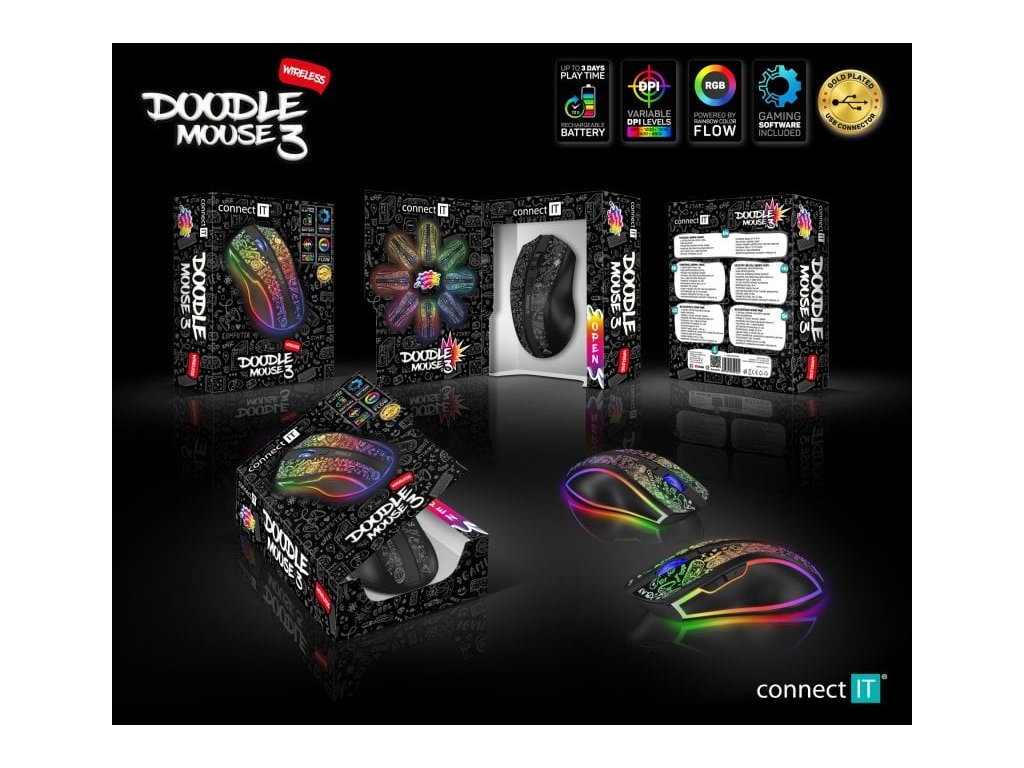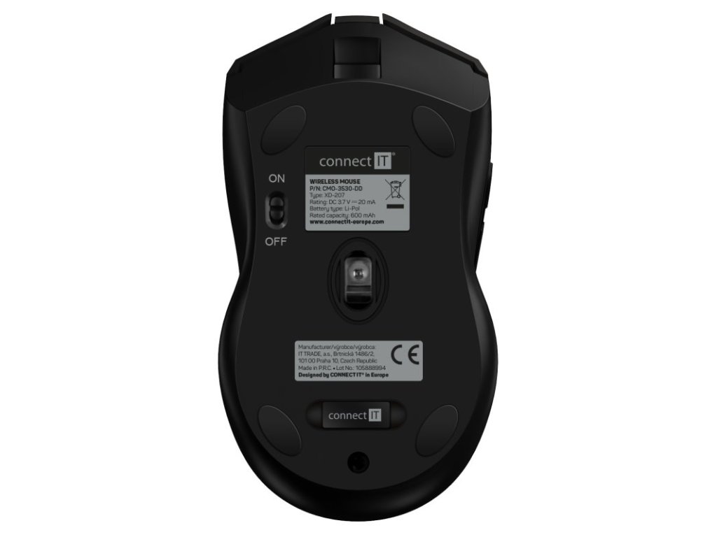 Myš využívá technologie jako povrchový RubberGrip pro eliminaci klouzavosti dlaně, UltraSlides Black pojezdy pro maximální možnou rychlost na podložce. Nechybí ani technologie AutoPowerSave šetřící kapacitu baterie. Software je zdarma ke stažení na stránkách www.connectit-europe.com. Vysokou odolnost garantují špičkové mechanické spínače Huano s životností 3 miliony kliknutí. Samozřejmostí je pozlacený USB Nano přijímač a dodávaný nabíjecí kabel.