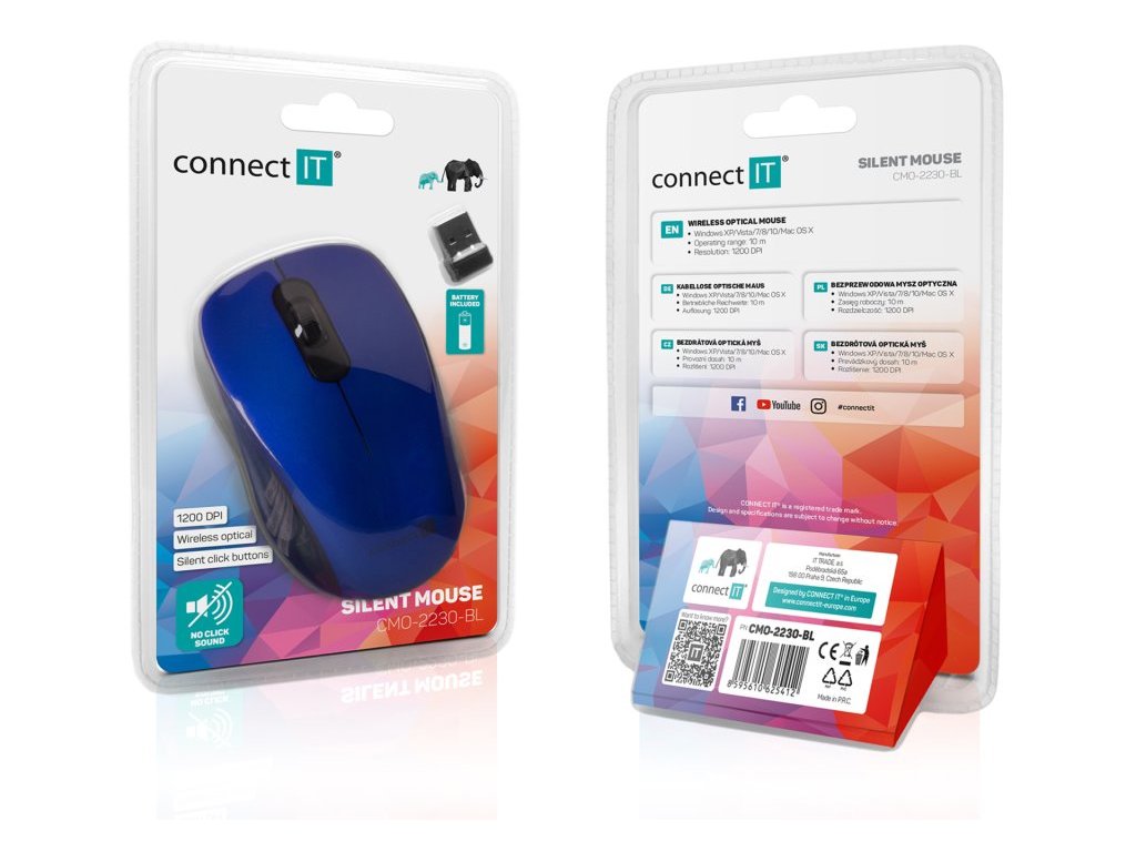 "MUTE" bezdrátová optická tichá myš CMO-2230-BLBezdrátová optická myš CONNECT IT "Mute" s tichým chodem tlačítek, které při klikání nevydávají žádný zvuk najde své uplatnění všude tam, kde uživatel vyžaduje absolutní soukromí a klid.. Myš neruší uživatele ani své okolí nepříjemným hlasitým klikáním známým z běžných modelů počítačových myší.