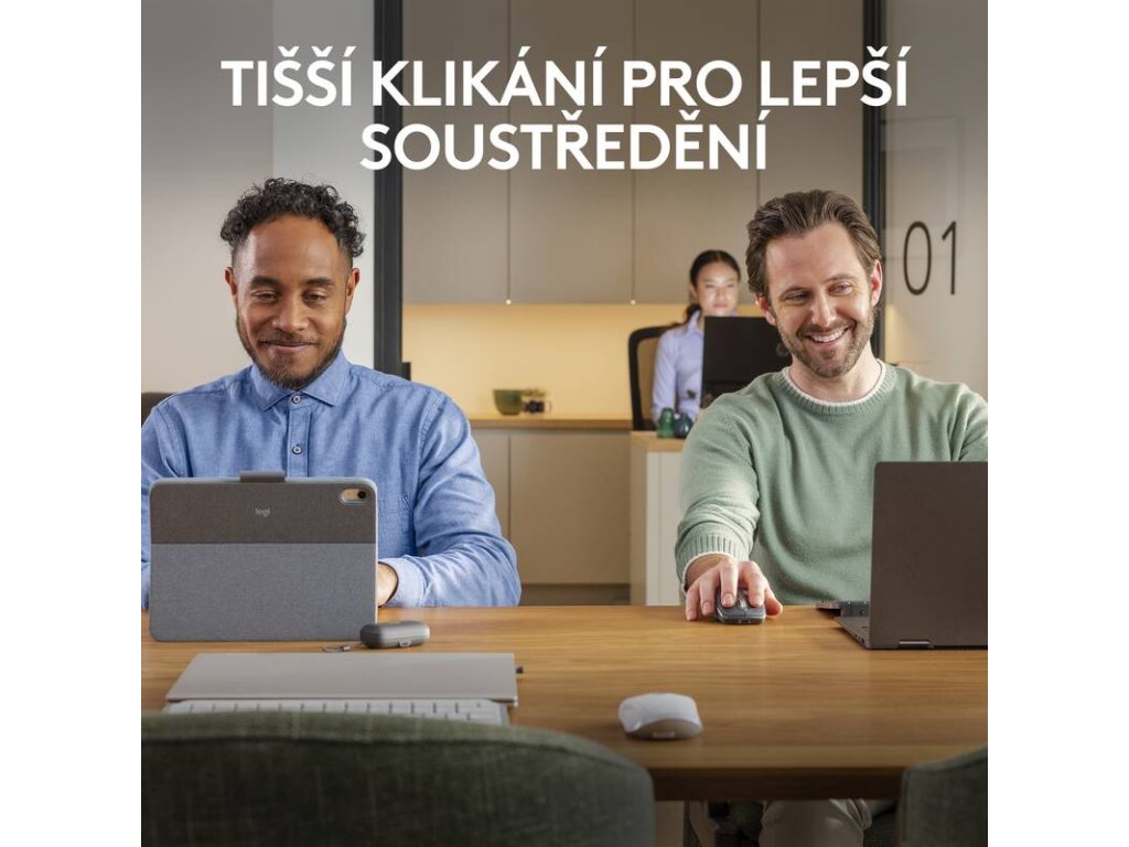 Myš MX Anywhere 3S představuje funkci tichého klikání – stejně uspokojující odezva, avšak s menším hlukem kliknutí (oproti myši MX Anywhere 3) pro menší rozptylování pozornosti a větší soustředění.