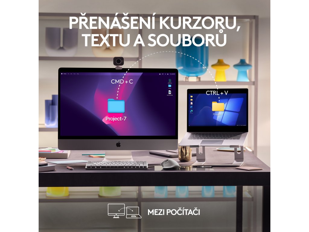 Vaše klávesnice MX kompatibilní bude následovat myš kompatibilní s technologií Flow z jednoho počítače do druhého – budete tak moci psát na více zařízeních v jednom plynulém prostředí. Přenášejte soubory, dokumenty a obrázky mezi zařízeními a operačními systémy macOS a Windows®