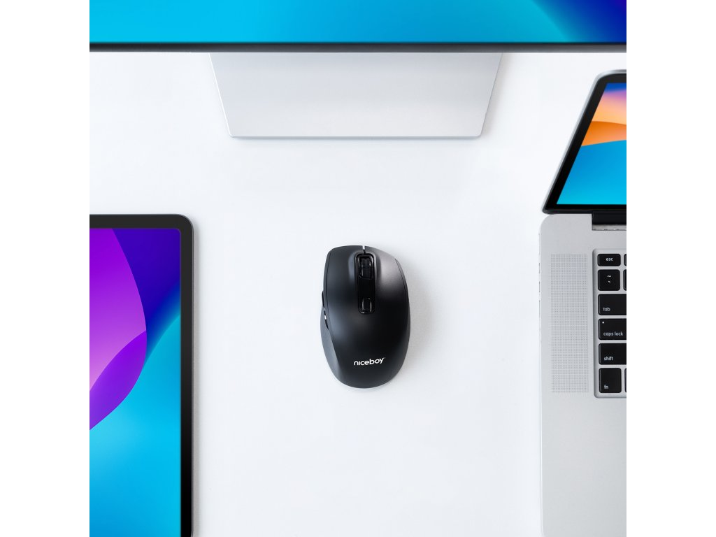 Myš Niceboy OFFICE M30 BT nabídne bezdrátové připojen až ke dvěma zařízením současně. Mezi nimi lze pak jednoduše přepínat tlačítkem na myši. S Plug & Play připojením se i velmi jednoduše používá - stačí vložit do zařízení miniaturní USB přijímač (který je součástí balení) nebo propojit pomocí Bluetooth a myš se k zařízením rovnou připojí bez potřeby jakýchkoliv dodatečných instalací ovladačů.