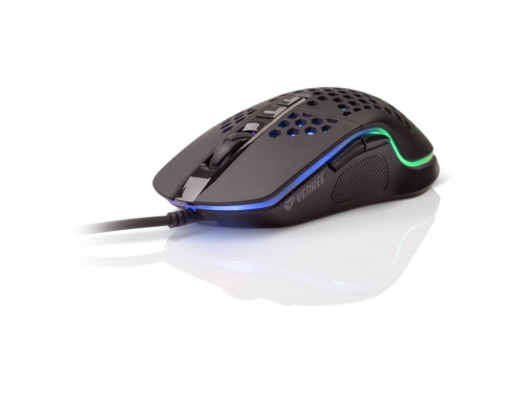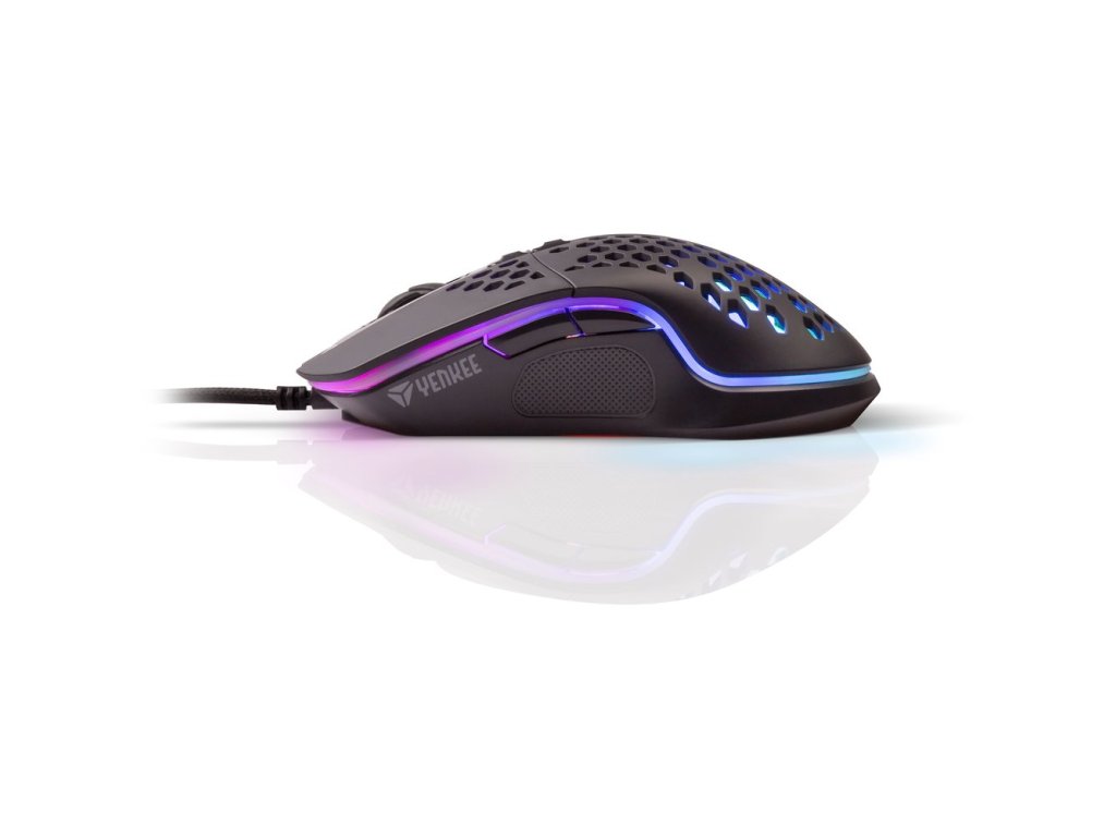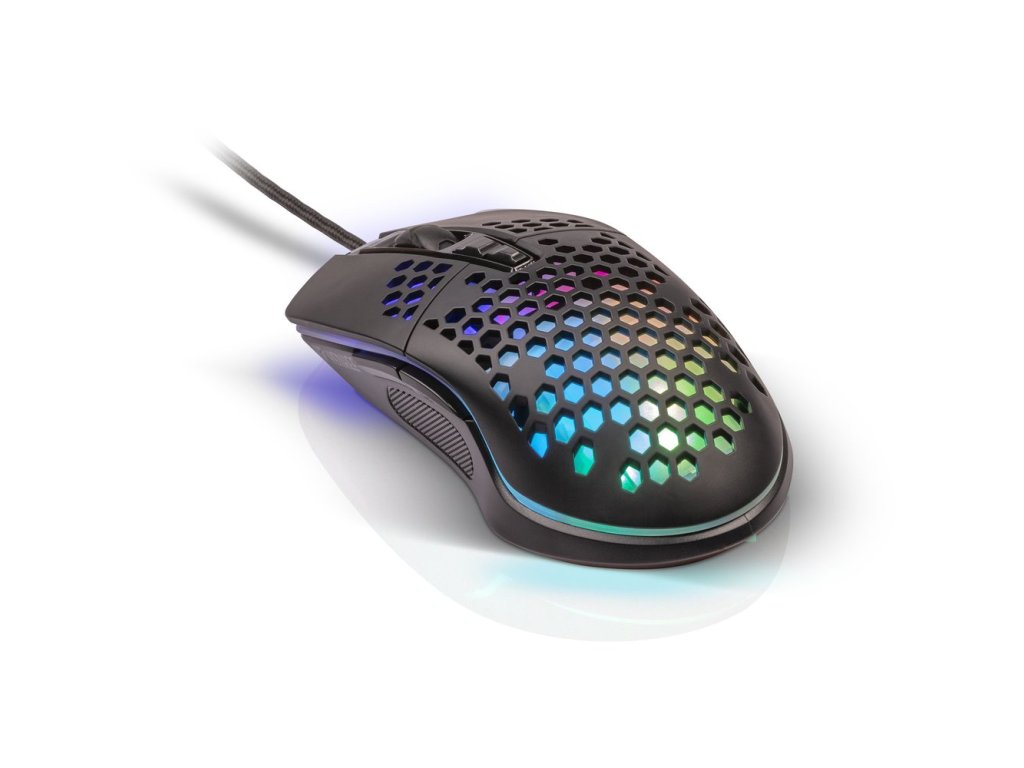 Shotgun. Ultralehká herní myš Shotgun. Jsem tvojí budoucí nejoblíbenější herní myší. Mé tělo je protkáno děrováním, které nejenom celou konstrukci značně zlehčuje, ale hlavně dodává na vzdušnosti. To zabezpečí, že se ti nebude při dlouhých herních maratonech potit ruka a cesta za vítězstvím bude ještě snažší!