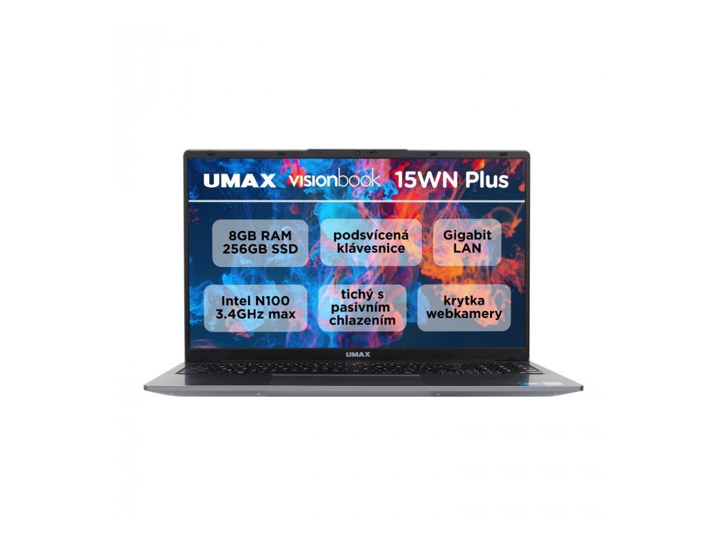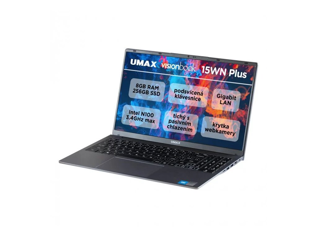 Moderní a kompaktní notebook Umax VisionBook 15WN Plus, který najde svoje uplatnění v domácnostech, na cestách, ve škole i ve firmách. Použitý procesor Intel Alder Lake N100 je navržen tak, aby poskytoval dostatečný výkon pro každodenní práci, přičemž zároveň minimalizuje spotřebu energie a tepla. Ideální volba pro ty, kteří hledají spolehlivý a tichý notebook pro práci i zábavu.Moderní technologie, tichý provoz bez větráku, atraktivní štíhlý design, kvalitní a velký Full HD displej 15,6" IPS, možnosti rozšíření a skvělý poměr cena / výkon jsou hlavními benefity této novinky. Potěší podsvícená komfortní a velká klávesnice s českými i slovenskými znaky včetně numerické části a velmi dobrá konektivita. Nechybí 2MP webová kamera s vlastní krytkou pro větší bezpečnost.