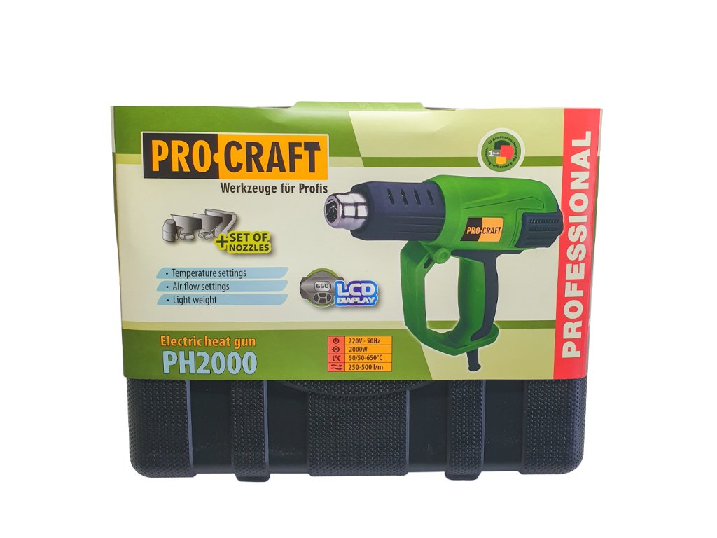 Horkovzdušná pistole Procraft PH2000 je určena k odstranění barev, laku, fólií, k sušení nových vrstev, k tvarování a ohýbání plastů. Regulace teploty v rozsahu 50-600°C a průtoku vzduchu