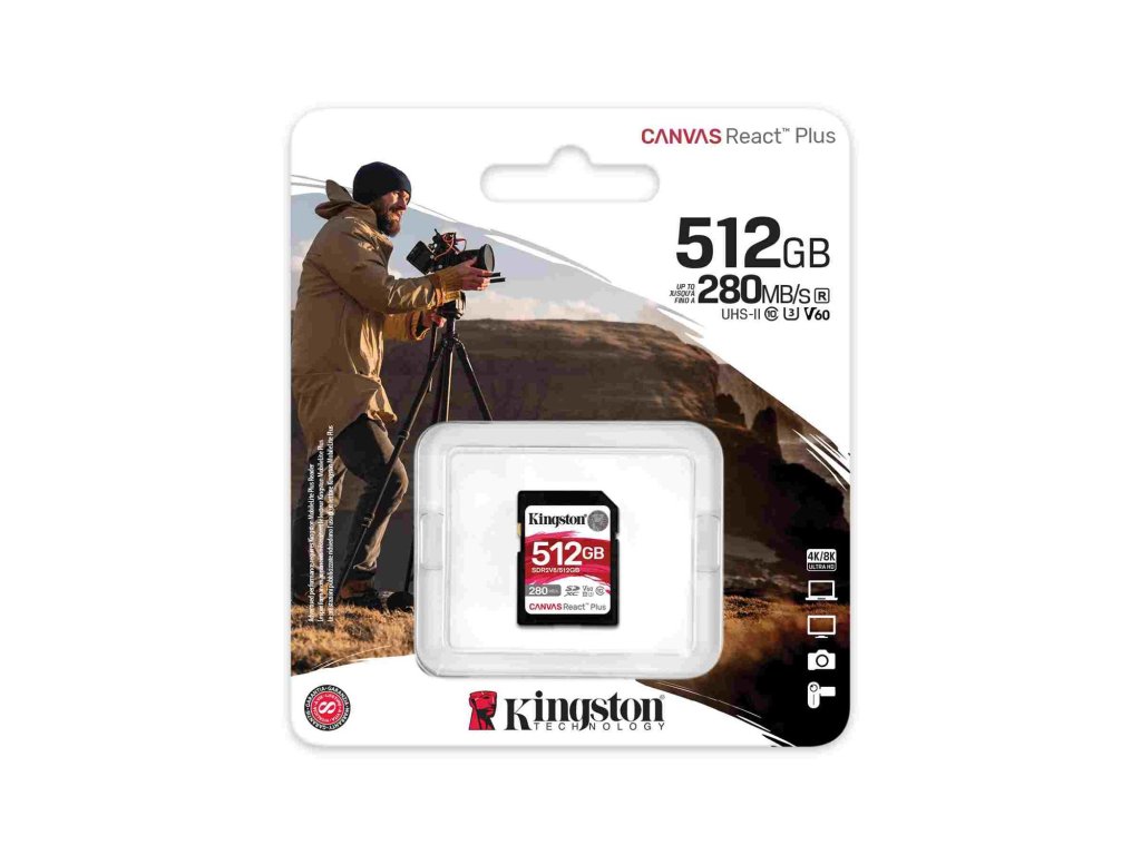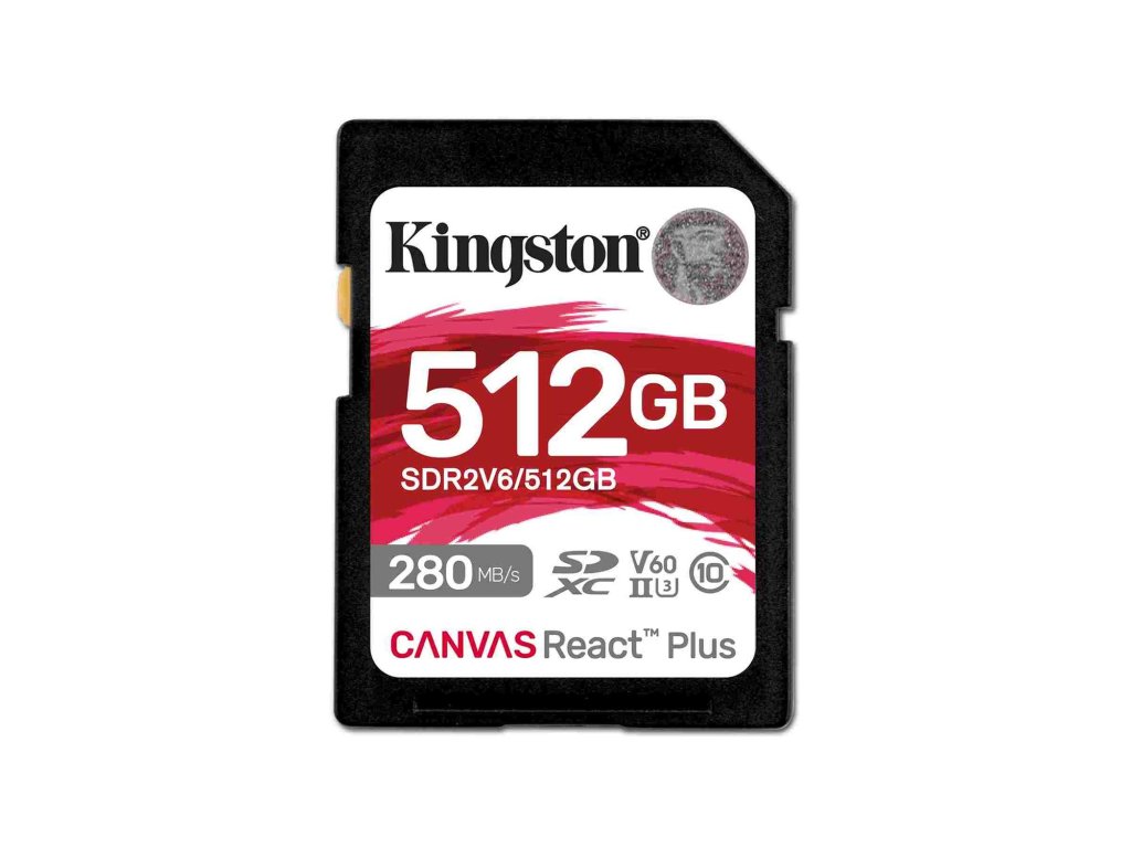 Kingston SDXC Karta Canvas React Plus SD karta Kingston Canvas React Plus V60 poskytuje působivý výkon pro kamery UHS-II pro zachycení 4K videa.Disponuje rychlostními třídami U3 a V60 s přenosovými rychlostmi až 280 MB/s a kapacitou 512GB.