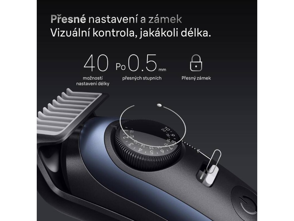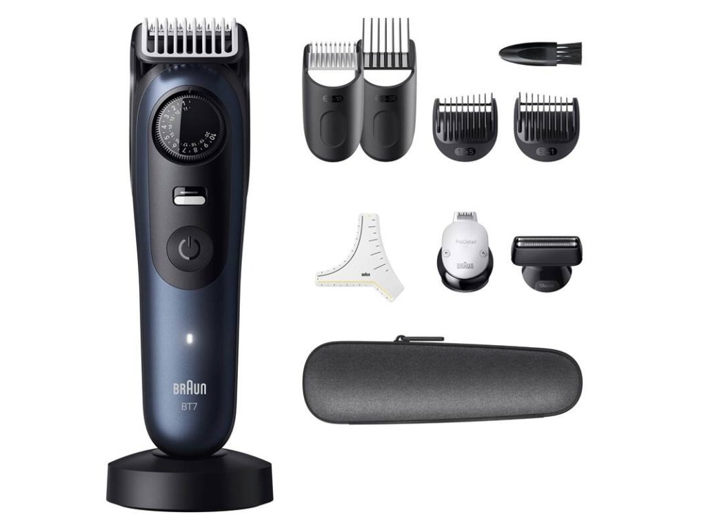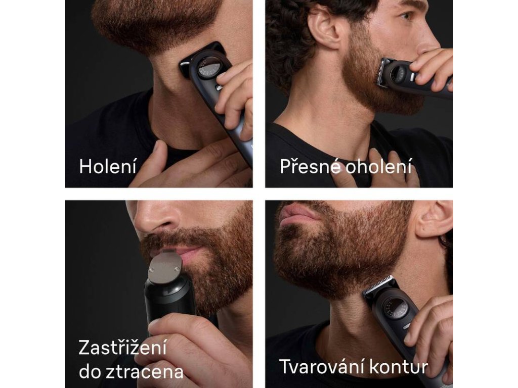Příslušenství: zastřihovač, 4 hřebenové nástavce, 2 prostřihovací nástavce, šablona na vousy, nabíjecí stojánek, pouzdro, čisticí kartáček