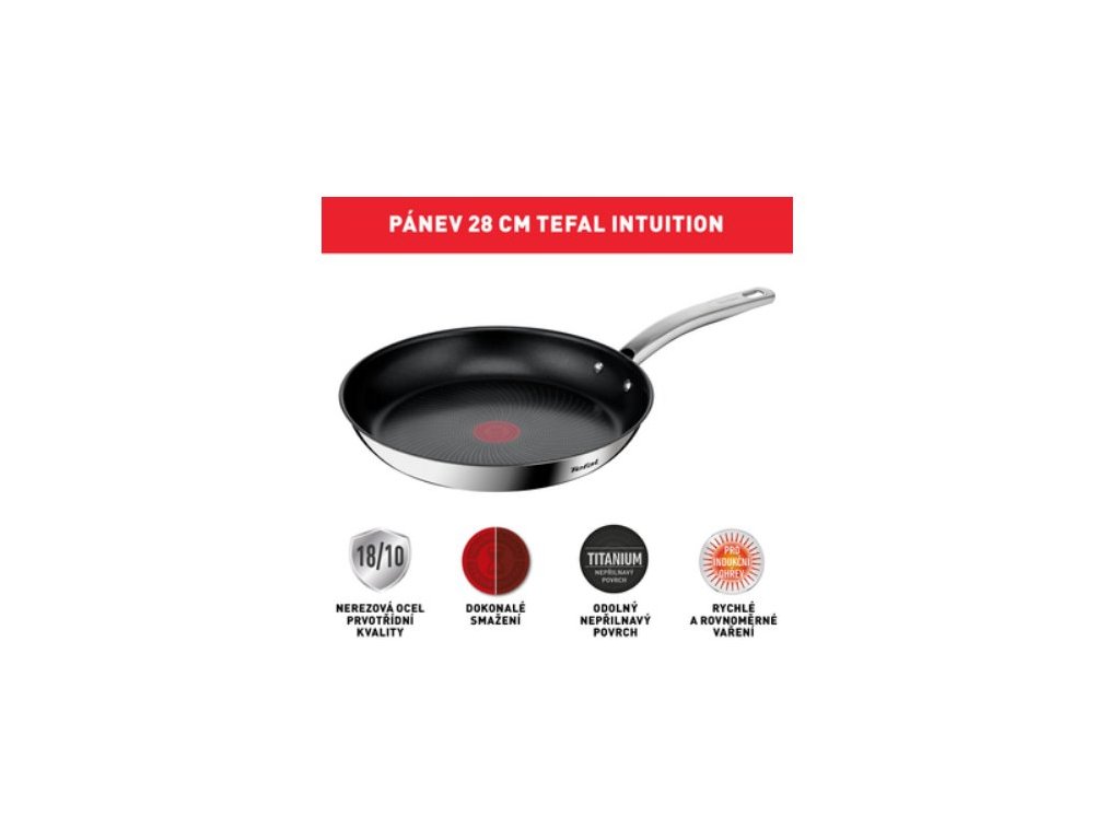 Nerezová pánev Tefal Intuition je kombinací stylu a skvělého výkonu při vaření. Tato pánev je vybavena nezbytnými funkcemi, které zajišťují jednodušší a bezstarostnější vaření.Je vyrobena z odolné a špičkové nerezové oceli, se zárukou 5 let. Její nepřilnavý povrch Titanium zajišťuje extrémní odolnost pro maximální životnost.
