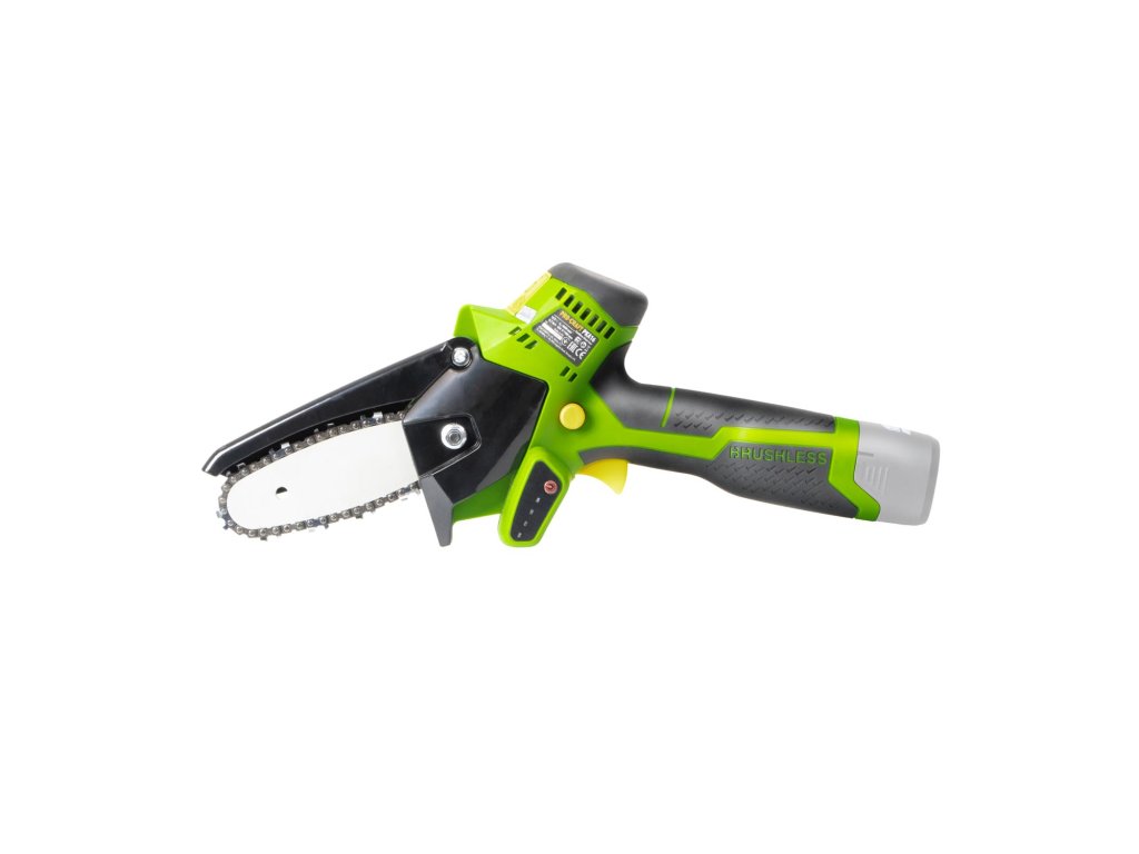 AKU jednoruční řetězová pila je díky svým kompaktním rozměrům užitečným pomocníkem při prořezávání stromů a keřů při práci v omezeném prostoru. Její provoz je v porovnání s většími stroji tichý. Je vybavena bezpečnostním krytem pilového řetězu. Stroj je dodávaný včetně vodící lišty a pilového řetězu v kartonu s montážním klíčem, nádobou na mazací olej.