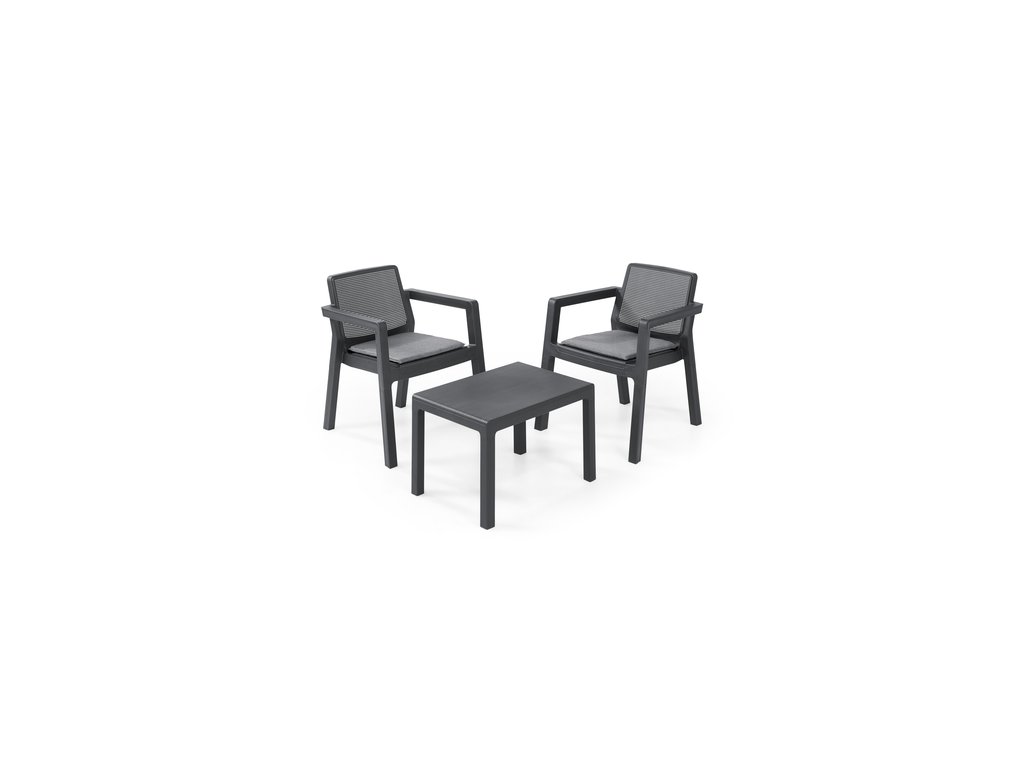 - Sada v grafitové barvě obsahuje stolek a dvě křesílka