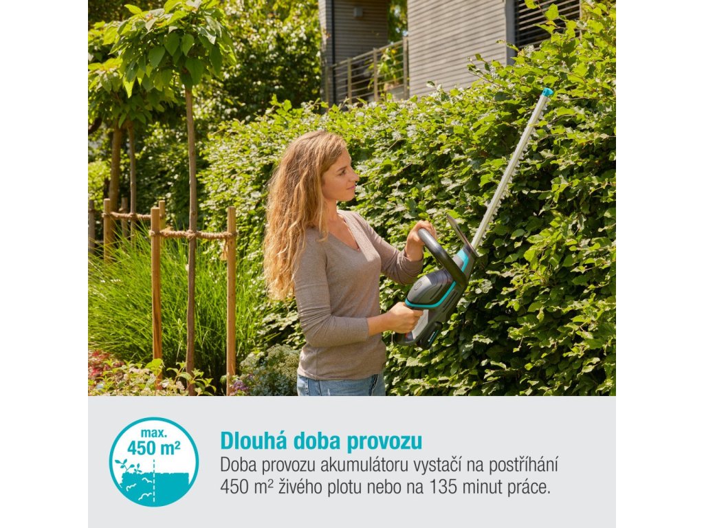 Díky jasně viditelnému LED indikátoru přímo na přístroji jste vždy informováni o aktuální úrovni nabití, takže budete vědět, kdy je čas si udělat přestávku, abyste jej buď nabili, nebo připojili jiný akumulátor. Nůžky na živý plot jsou kompatibilní se všemi akumulátory 18V z Aliance POWER FOR ALL. V závislosti na typu použitého akumulátoru může výrobek dosáhnout doby chodu až 135 minut a ostříhat až 450 metrů čtverečních živého plotu.