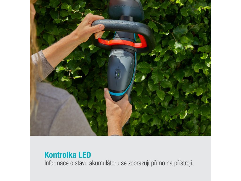 Akumulátor poskytuje dobu chodu v trvání až 56 minut nebo zvládne ostříhat až 188 metrů čtverečních živého plotu. Díky jasně viditelnému LED indikátoru přímo na přístroji jste vždy informováni o aktuální úrovni nabití, takže budete vědět, kdy je čas si udělat přestávku, abyste jej buď nabili, nebo připojili jiný akumulátor.