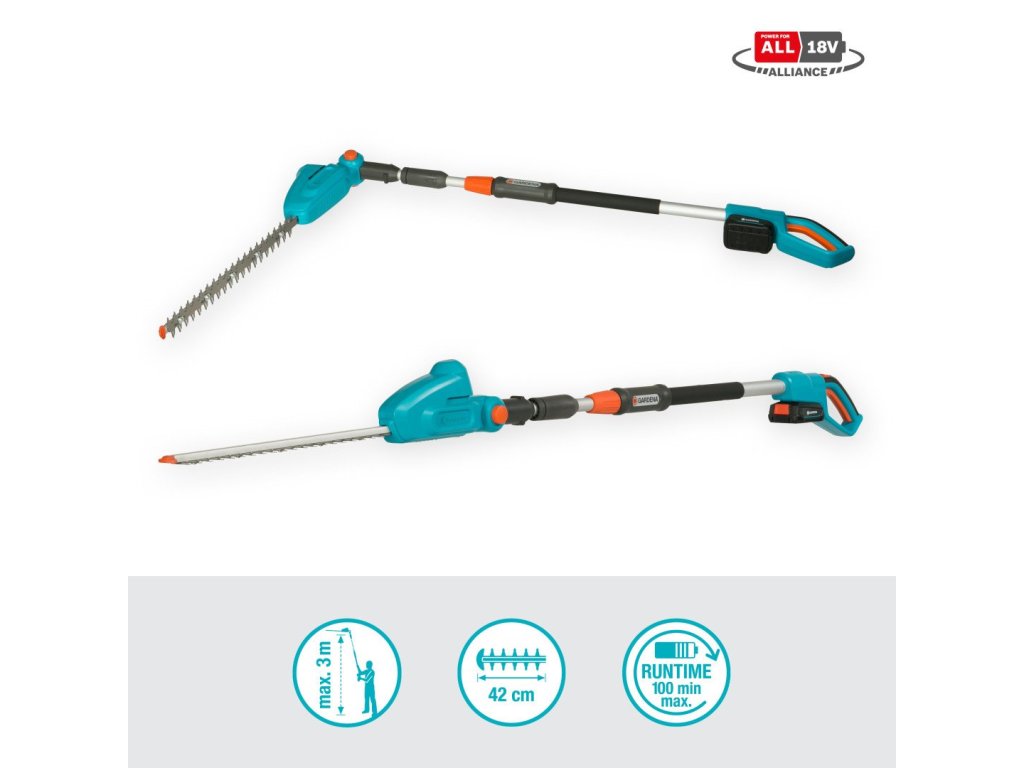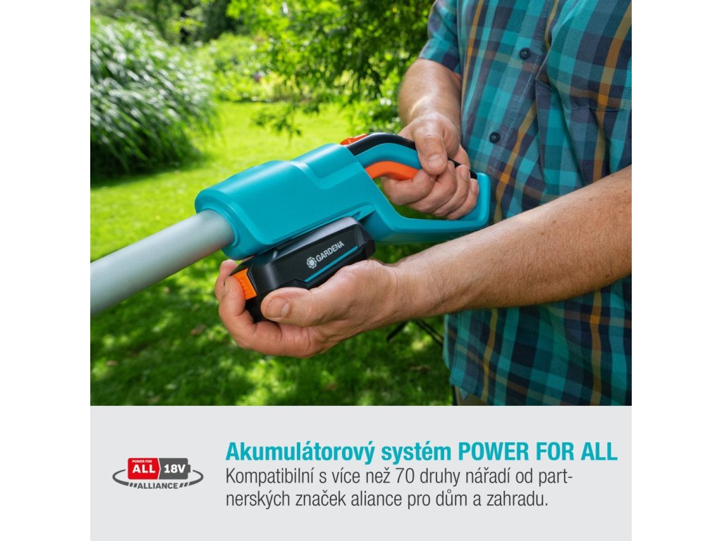 GARDENA akumulátorové teleskopické nůžky na živý plot THS 42/18V P4A se dodávají s 18 V akumulátorem z Aliance POWER FOR ALL a nabíječkou jako sada k okamžitému použití. Aliance POWER FOR ALL je jednou z největších aliancí předních světových výrobců akumulátorů různých značek. Akumulátor je proto kompatibilní s řadou dalších přístrojů pro dům a zahradu – takže ušetříte peníze a zajistíte si trvalou flexibilitu. Vášeň poháněná značkou GARDENA - zahradní akumulátorové vybavení, které vám poskytuje svobodu při práci.