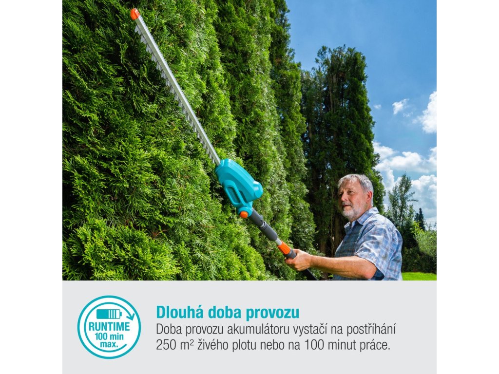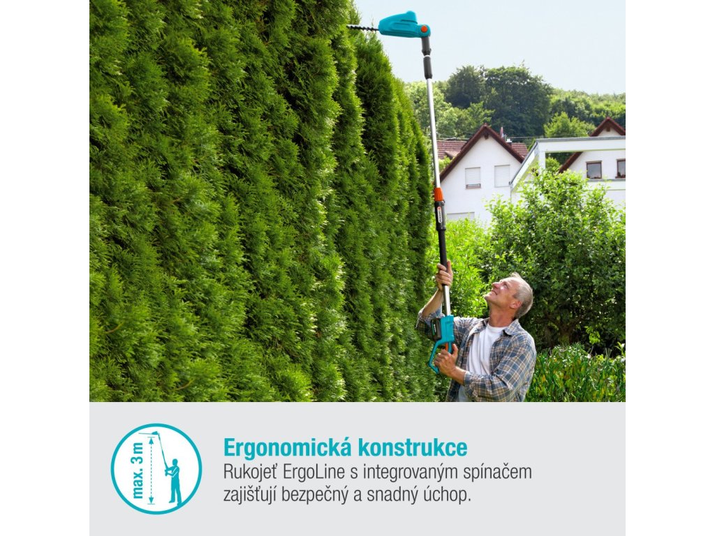 Akumulátorové nůžky na živý plot s teleskopickou násadou pro vysoké živé plotyVysoké živé ploty chrání soukromí. Problém ale vznikne při stříhání - brzy si budete přát, aby soukromí nebylo takovou prioritou, protože by vám to hodně usnadnilo práci. Pokud ovšem nepoužíváte akumulátorové teleskopické nůžky na živý plot GARDENA THS 42/18V P4A. Snadno zvládnou i živé ploty s výškou 3 m. Stříhání z vratkého žebříku je minulostí, celou dobu budete stát oběma nohami bezpečně na pevné zemi a nebudete se muset starat o napájecí kabely.
