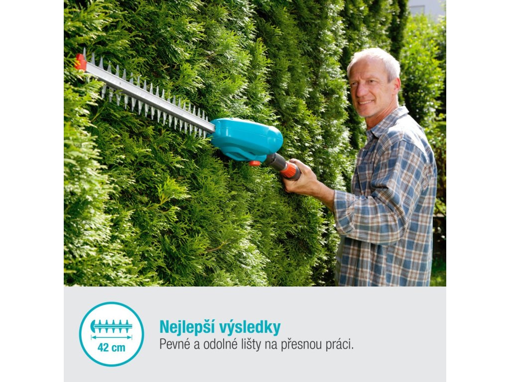 Bez větší námahy ostříhá větve a výhonky do tloušťky 16 milimetrů; optimalizovaná geometrie nožů zajišťuje efektivní a čistý střih. Díky délce nožů 42 centimetrů rychle ostříháte živý plot po celé jeho šířce.