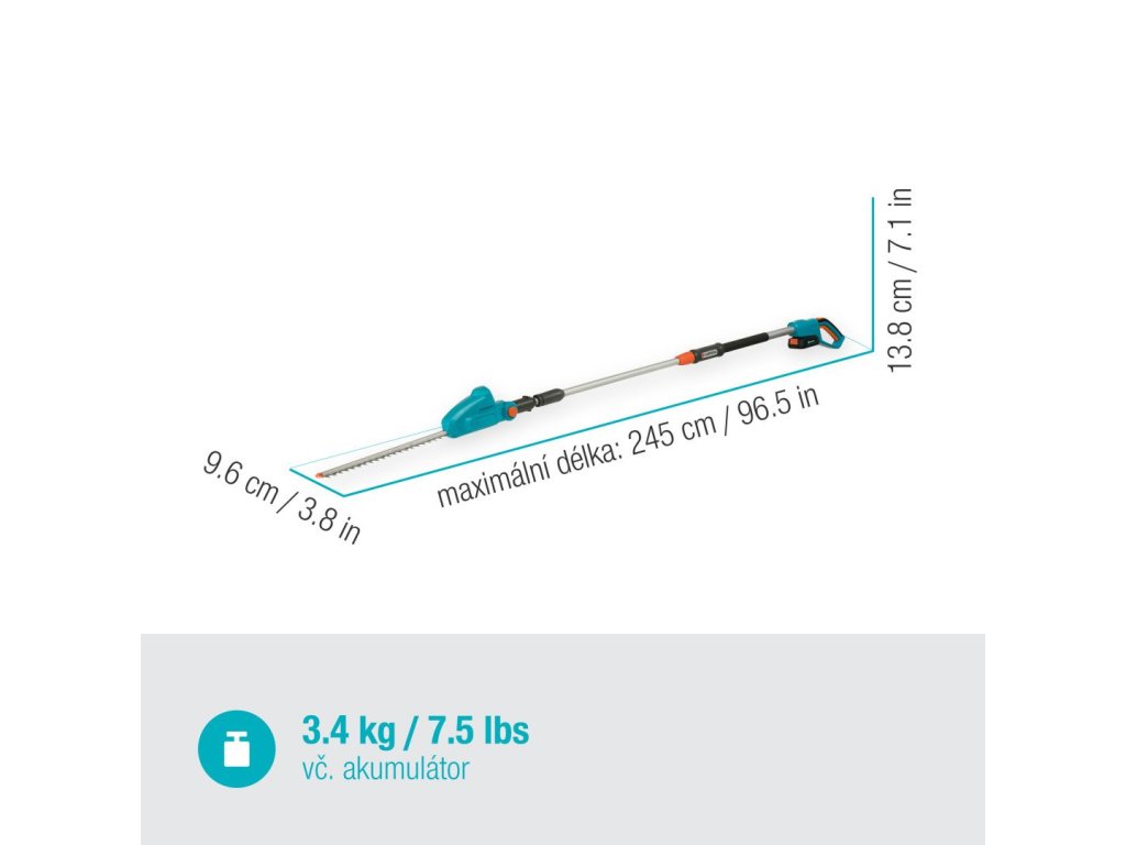 Teleskopické nůžky váží včetně akumulátoru 3,4 kilogramu; jejich rukojeť je ergonomicky navržena a má ideální těžiště. Znamená to, že vám pohodlně a bezpečně padnou do ruky, i v případě, že je teleskopická rukojeť plně vysunuta, takže využijete celý dosah tří metrů. Potřebujete zastřihnout vršek živého plotu? Ani to není problém: hlavu zastřihovače lze naklonit - tato funkce je také velmi pohodlná při řezání půdopokryvných rostlin. Už se nemusíte ohýbat a odlehčíte také namáhání svých kolen.