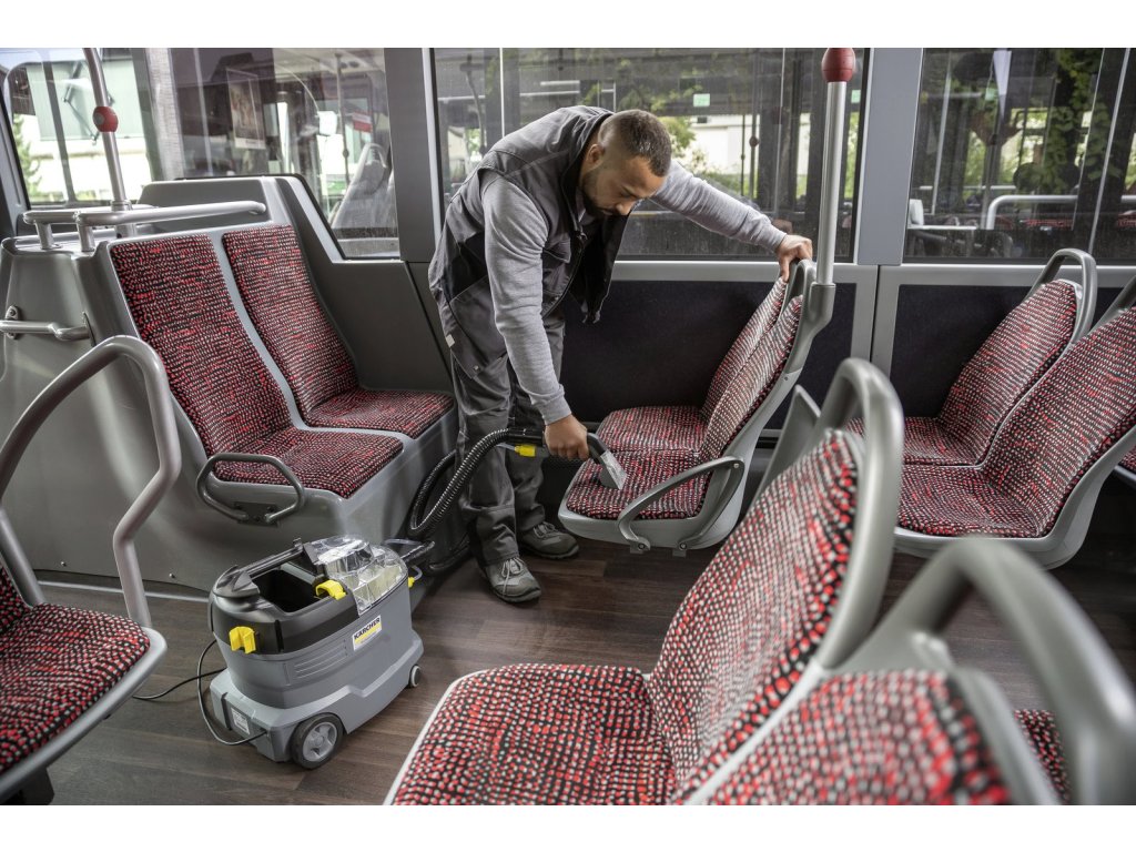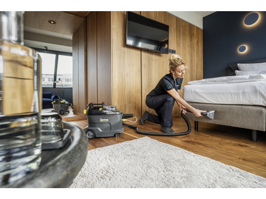 Robustní, odolný, účinný: Sprejový extrakční čistič Puzzi 8/1 působivě čistí čalounění a odstraňuje skvrny z textilních povrchů s vynikajícími a hygienickými výsledky čištění a vysokou účinností. Kompaktní sprejový extrakční stroj nastříká čisticí roztokhluboko do textilních vláken a poté jej opět odstraní s uvolněnými nečistotami. Tento vynikající výkon zpětného sání také zajišťuje rychlé schnutí a znamená, že textilní povrchy lze rychle znovu použít – ideální pro vysoké nároky profesionálů v oblasti