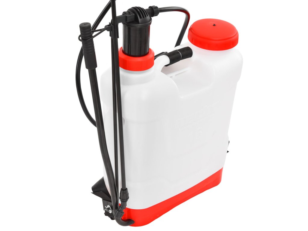Tlakový zádový postřikovač s objemem nádoby 16 litrů. Pomocí páky lze ručně tlakovat přímo na zádech. Maximální tlak je 4 bar. Pistole je vybavena nastavitelnou tryskou. Délka postřikovacího nástavce je 71 cm a délka hadice je 1,5 m. Trubka je vyměnitelná, lze ji proto v případě potřeby nahradit jinou, například delší (nutno dokoupit, není součástí). Hmotnost 3,1 kg. Max. teplota postřikové kapaliny je 40°C.Při platbě penězi je možné dostat zajímavou nabídku neboli akční cenu a tu Vám rádi uděláme když napíšete na info@megabike-cyklo.cz