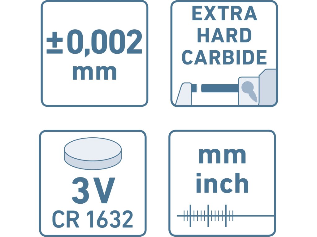 | doplňující parametr: | rozlišení 0,001mm, přesnost ±0,002mm, baterie 3V typ CR1632, baleno v plastovém kufříku |