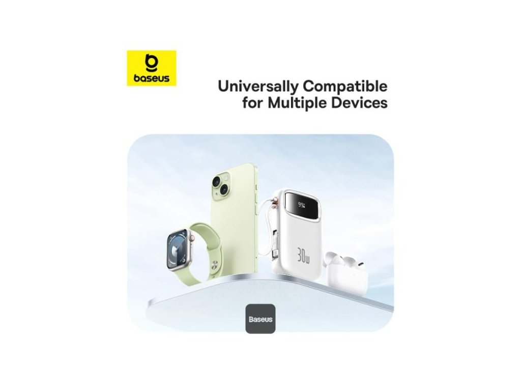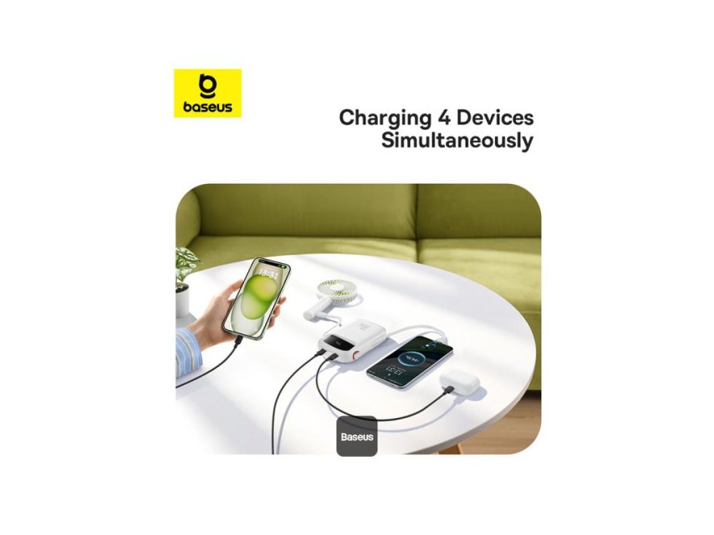 Powerbanka je vybavena dvěma porty USB-C, jedním portem USB-A a má zabudovaný kabel USB-C. Jedná se o řešení, které umožňuje nabíjet několik zařízení současně. Ať už potřebujete nabíjet chytrý telefon, tablet, sluchátka nebo jiné přístroje, Baseus QPow 2 vám poskytne potřebnou všestrannost.