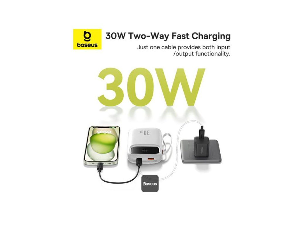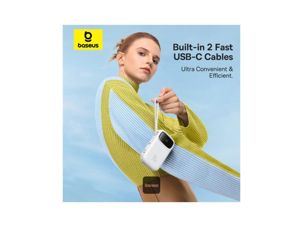 Zapomeňte na těžké a objemné powerbanky! Baseus QPow 2 se vyznačuje lehkou (360 g), kompaktní konstrukcí, která se snadno vejde do každé tašky nebo batohu. Díky praktické rukojeti ji můžete mít vždy po ruce a díky integrovanému kabelu USB-C nemusíte nosit další kabely.