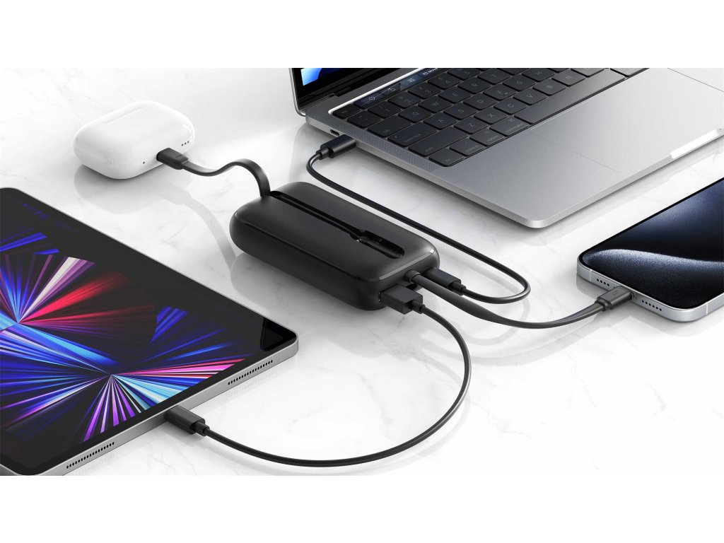 Vestavěné kabely USB-C a Lightning poskytují maximální flexibilitu a pohodlí, což umožňuje nabíjet zařízení se systémem Android i iOS bez nutnosti nosit další příslušenství. K dispozici je také port USB-A s výkonem až 22,5 W pro nabíjení dalších zařízení.