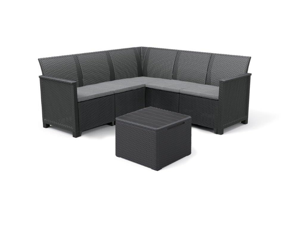 Díky nábytku Keter Elodie si na zahradě, terase, v pergole či na balkoně vytvoříte krásné a pohodlné posezení. Připravíte se na slunečné dny, které strávíte u kávy na čerstvém vzduchu, nebo pozvete na návštěvu své příbuzné a přátele. Sada obsahuje rohovou sedačku a stolek s praktickým úložným prostorem. Do něj můžete uchovat například podsedáky. Celkově vám poskytne 5 míst k sezení.