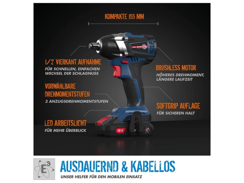 Akumulátorový rázový utahovák ze série akumulátorového nářadí 18V E 3 .Praktický a výkonný, dlouhý pouhých 155 mm. Bezkartáčový motor pro lepší výkon a delší životnost. 1/2" čtyřhranné upínání s pružinovým kroužkem pro rychlou a snadnou výměnu nástroje.