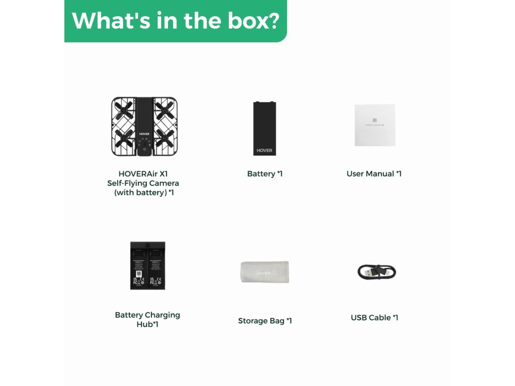 Obsah balení: dron HOVERAir X1 (s baterií), extra baterie, návod k použití, hub pro nabíjení baterií, taška, USB-C kabel.