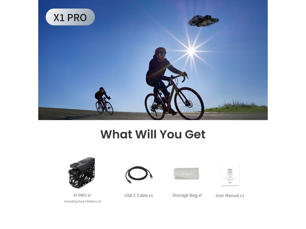 Obsah balení: HOVERAir X1 Pro (s baterií), USB-C kabel, návod k použití.