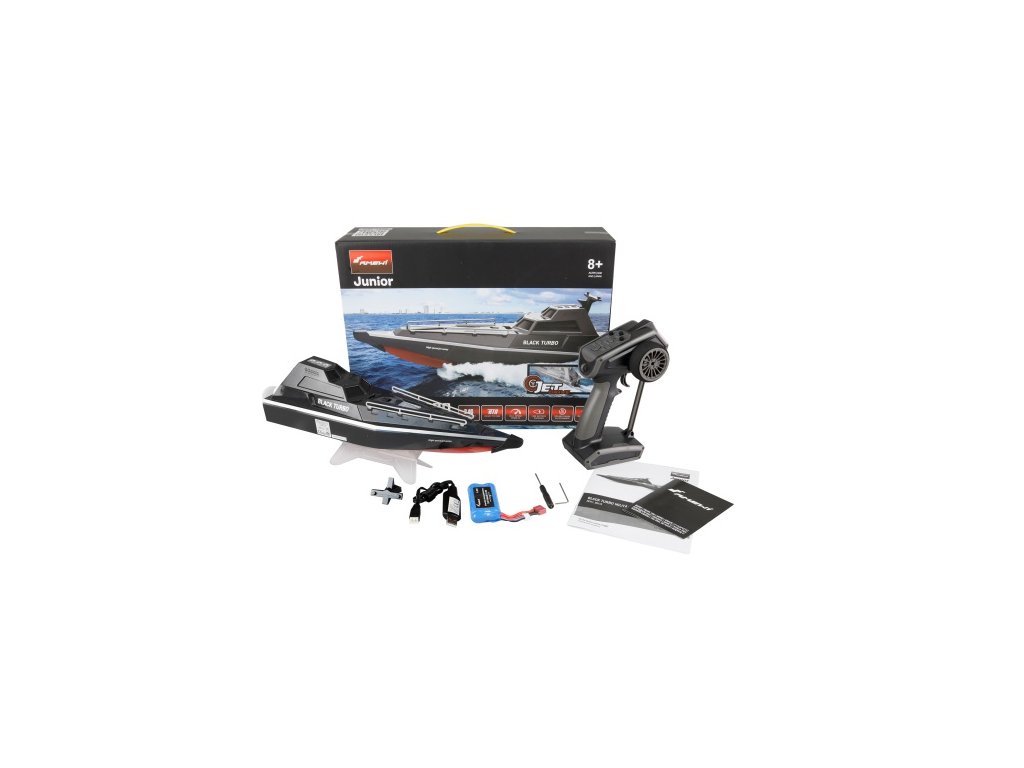 Člun na dálkové ovládání Black Turbo v černé barvěPřipravte se na adrenalinové zážitky s RC vojenským člunem Black Turbo, který přináší nejen neotřelý design, ale i vyspělou technologii. Tento model je stvořen pro všechny nadšence do rychlých lodí a technických novinek, kteří hledají kvalitu a výkon. S délkou 420 mm a šířkou 95 mm se tento člun stává skutečným mistrem ve své kategorii. S RC vojenským člunem Black Turbo se každé vodní dobrodružství stane nezapomenutelným zážitkem. Nechte se unášet vlnami rychlosti a technologie, objevte nový horizont zábavy na vodní hladině.Odolný model s vyspělou technologiíBlack Turbo využívá tryskovou technologii, díky tomu jsou plavby rychlé a hladké. Nasávání a vypuzování vody zajišťuje vynikající zrychlení a rychlost až 28 km/h. Zajisté oceníte vysokou manévrovatelnost. Součástí modelu je řízení s vektorem tahu, můžete tedy ovládat člun s neuvěřitelnou přesností. Proplétání se mezi překážkami nebylo nikdy jednodušší. Pokud se však setkáte s menším nezdarem, nezoufejte, Black Turbo něco vydrží. Trup vyrobený z vysoce odolného ABS plastu zajišťuje, že člun vydrží i náročnější podmínky a je odolný vůči nárazům. A navíc rychloupínací kryt trupu a kartáčovaný motor s aktivním vodním chlazením zaručují snadnou údržbu a dlouhou životnost motoru.RTR model s dobou provozu až 12 minutSystém dálkového ovládání 2,4 GHz s mnoha funkcemi, včetně nastavitelné rychlosti a trimu, poskytuje úplnou kontrolu nad lodí a jejím chováním na vodě. Akumulátor Li-Ion 7,4 V 1500 mAh umožňuje 10-12 minut jízdy na vodní hladině. Baterii nabijete pomocí USB nabíječky za 90-120 minut. 4kanálový ovladač funguje na frekvenci 2,4 GHz a jeho dosah je 60-80 m. Model RTR je kompletně sestavený s ovladačem, baterií a USB nabíjecím kabelem, takže ihned po vybalení můžete vyrazit na vodu. Ke zprovoznění budete potřebovat pouze 4 x AA baterie do dálkového ovládání.Dodáváme také v šedé barvě. Obsah balení: Model vojenský člun Black Turbo - černá Dálkové ovládání 2,4 GHz Baterie Li-Ion 2S 7,4 V 1500 mAh 15C Nabíjecí USB kabel Sada nářadí Technické parametry: Délka: 42 Šířka: 9.5 Výška : 12 Rychlost: 28 Výdrž: 12 Kapacita akumulátoru: 1500 Napětí akumulátoru: 7.4 Typ akumulátoru: Li-ion Typ nabíječky: USB Vodou chlazený motor: ano Barva: černá Dosah: 80Při platbě penězi je možné dostat zajímavou nabídku neboli akční cenu a tu Vám rádi uděláme když napíšete na info@megabike-cyklo.cz