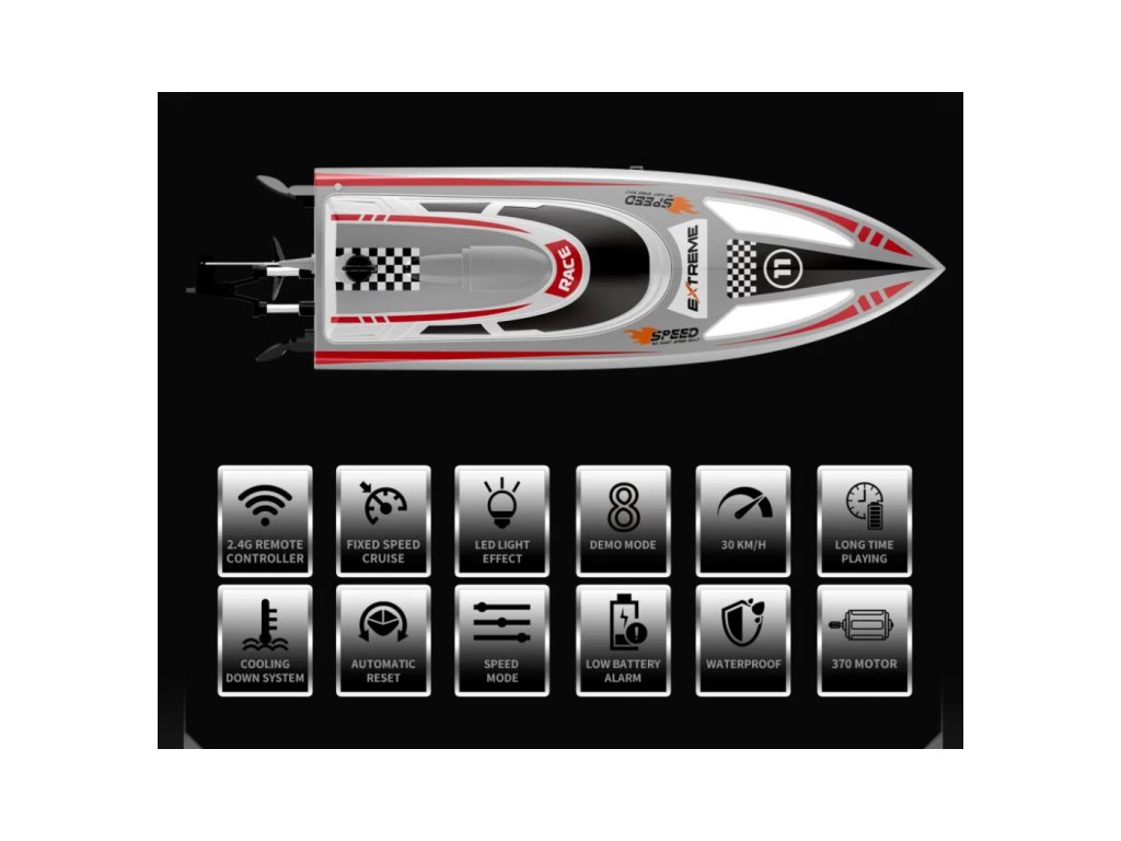 Loď na dálkové ovládání V003RC loď je skvělý způsob, jak se zabavit v létě u vody. Model V003 je ideální volba díky svým funkcím. Dokáže na jedno nabití plout cca 30 minut díky akumulátoru LiPo 7,4V 1200 mAh. Velikou výhodou je signalizace kapacity akumulátoru a dosahu, takže se vám nestane, že byste museli pro loď plavat. Se silným motorem si užijete spoustu zábavy. Vodou chlazený motor RC loď V003 je rychlý člun na dálkové ovládání, který má vodou chlazený motor. Vodní chlazený prodlužuje životnost a zabraňuje přehřívání motoru. Naprogramovaná je i DEMO verze, kdy loď pluje ve tvaru 8. Další skvělou funkcí je ,,automatic reset,, kdy se vám loď otočí při převrácení zpět na hladinu, takže můžete bez obav vyrazit i do vln. 3 rychlostní režimy Rychlost lodi se pohybuje okolo 30 km/h, pomocí tlačítka na dálkovém ovládání můžete střídat 3 rychlostní režimy nebo využít funkci tempomatu. Dokáže plout všemi směry, dokonce má i zpátečku. Loď je vybavena LED osvětlením, které je krásně viditelné i při noční plavbě, ale také má signalizační funkci. Dálkové ovládání vám zapípá, loď bliká a přejde do pomalého režimu v případě, že je akumulátor na hraně kapacity. V případě, že dojedete až na hranu dosahu, dálkové ovládání vám začne blikat. Dosah dálkového ovládání je 150m, funguje na frekvenci 2,4 Ghz. Do dálkového ovladače potřebujete 4xAA baterie. Obsah balení: RC loď V003 Dálkové ovládání USB nabíječka Akumulátor Náhradní lodní šroub Klíček pro výměnu lodního šroubu Technické parametry: Délka: 35 Šířka: 9.2 Výška : 9.2 Rychlost: 30 Výdrž: 30 Kapacita akumulátoru: 1200 Napětí akumulátoru: 7.4 Typ akumulátoru: Li-Po Typ nabíječky: USB Výměnný akumulátor: ano Napájení ovladače: 4xAA Vodou chlazený motor: ano Barva: šedá Proporcionální plyn: ano Proporcionální zatáčení: ano LED osvětlení: ano Dosah: 150 Vodotěsnost: anoPři platbě penězi je možné dostat zajímavou nabídku neboli akční cenu a tu Vám rádi uděláme když napíšete na info@megabike-cyklo.cz