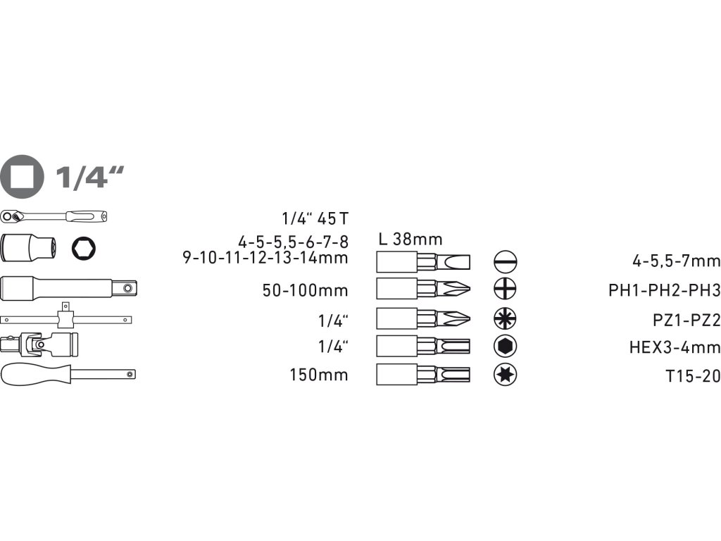 | hlavice nástrčné: | 1/4": 4-5-5,5-6-7-8-9-10-11-12-13-14mm |