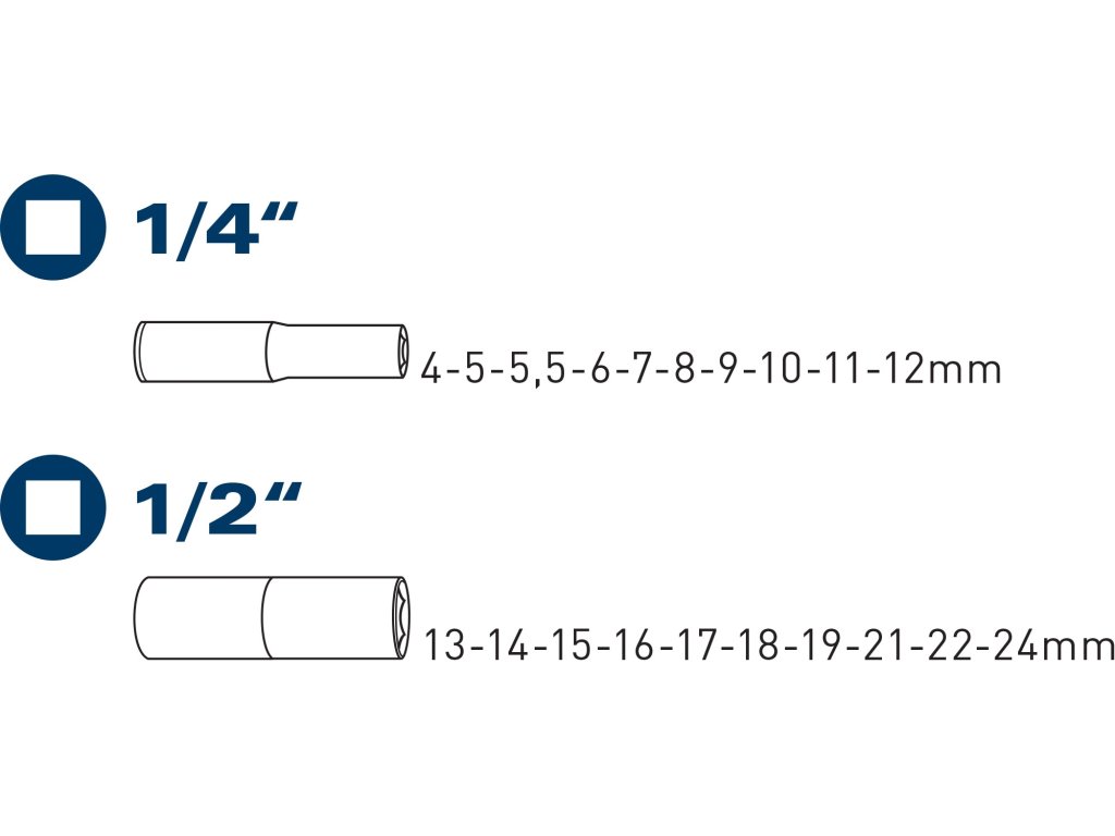 | hlavice nástrčné prodloužené: | 1/4": 4-5-5,5-6-7-8-9-10-11-12mm, 1/2": 13-14-15-16-17-18-19-21-22-24mm |