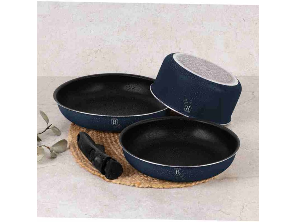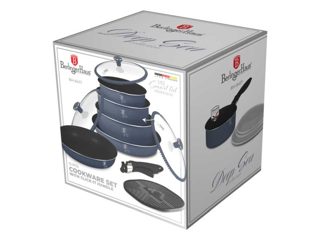 Sada nádobí Berlingerhaus Click It XL z kolekce Deep Sea Collection je vyrobena z kovaného hliníku a vybavena odolným nepřilnavým povrchem TitanPro, který zajišťuje vaření s minimem tuku a snadné čištění. Chytré poklice s parním ventilem a funkcí cezení usnadňují každodenní přípravu jídel. Ergonomická odnímatelná rukojeť Click It a měkký povrch Stay Cool zaručují pohodlnou manipulaci bez rizika popálení. Turbo indukční dno se postará o rychlý a rovnoměrný ohřev, a to na všech typech varných desek. Minimalistický design v modré a šedé barvě navíc dodá vaší kuchyni styl.