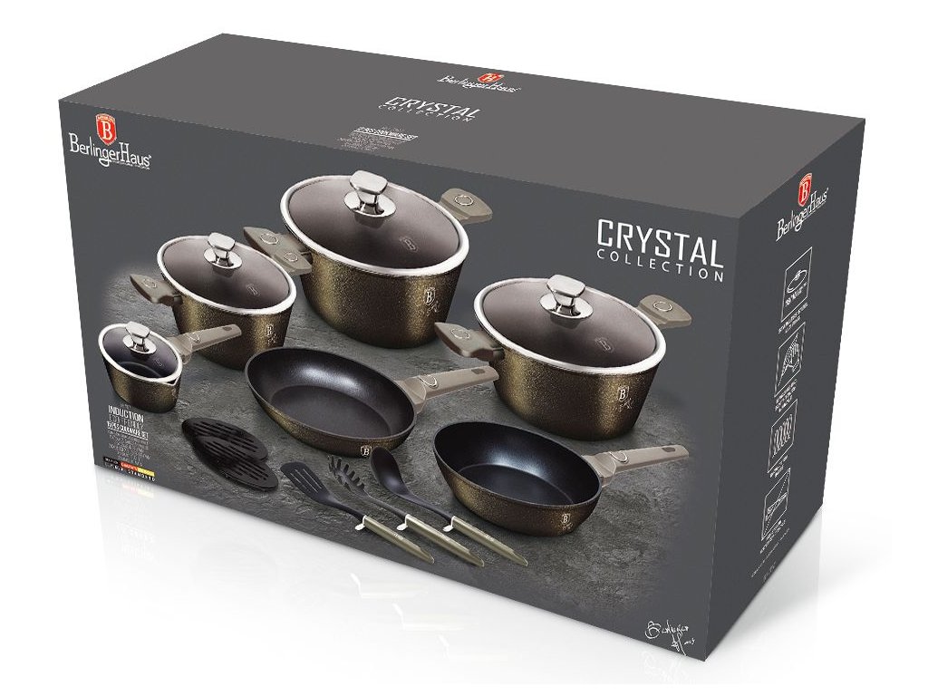 Berlingerhaus Crystal Collection je exkluzivní 15dílná sada nádobí s titanovým povrchem, která spojuje moderní vzhled, vysokou kvalitu a praktické využití. Díky 3vrstvému titanovému povrchu s částicemi titanu je vaření zdravější, potraviny se nepřipalují a údržba je snadná a rychlá.