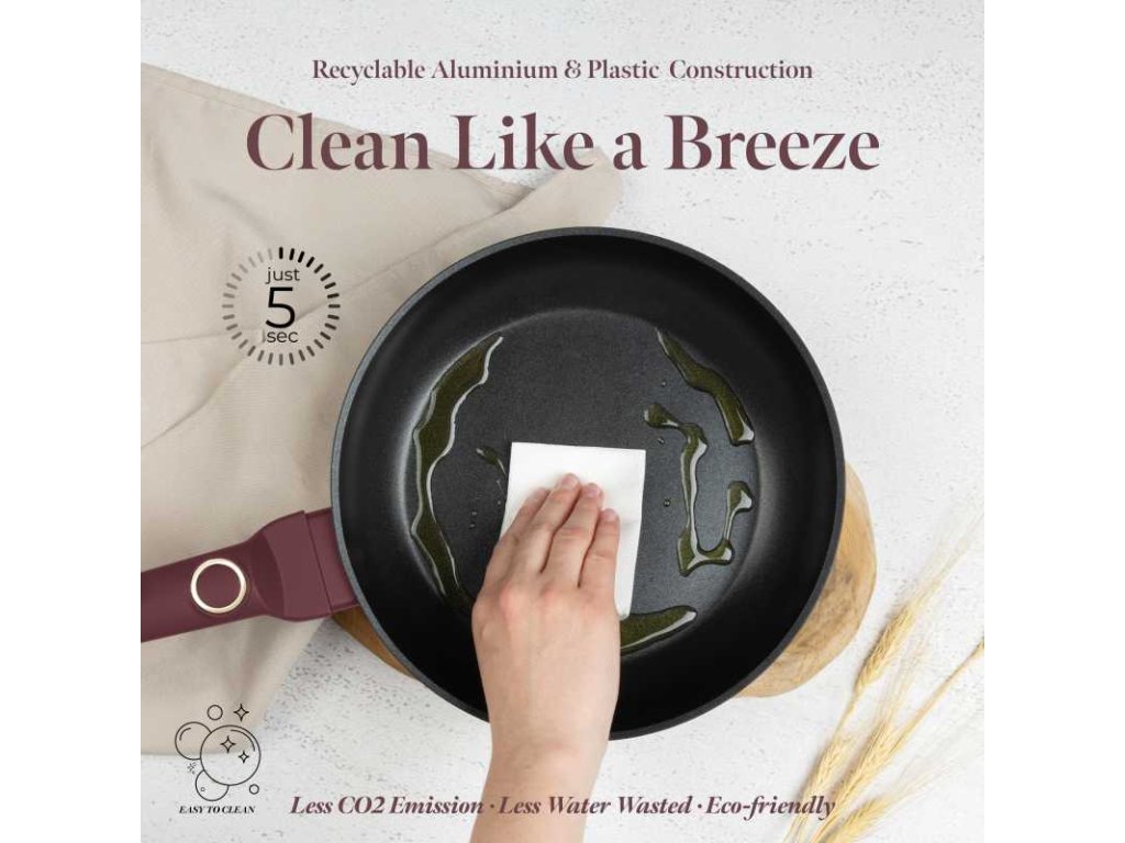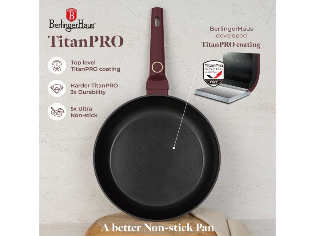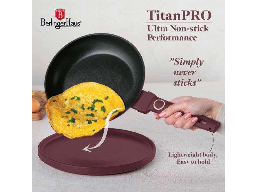 Nádobí je vyrobeno z kovaného hliníku s titanovým nepřilnavým povrchem TitanPro, který umožňuje zdravé vaření s minimem tuku a snadnou údržbu. Turboindukční technologie zajišťuje rychlý přenos tepla a rovnoměrné zahřívání po celé ploše. Ergonomické rukojeti Stay Cool zůstávají chladné a zvyšují bezpečnost i komfort při manipulaci.