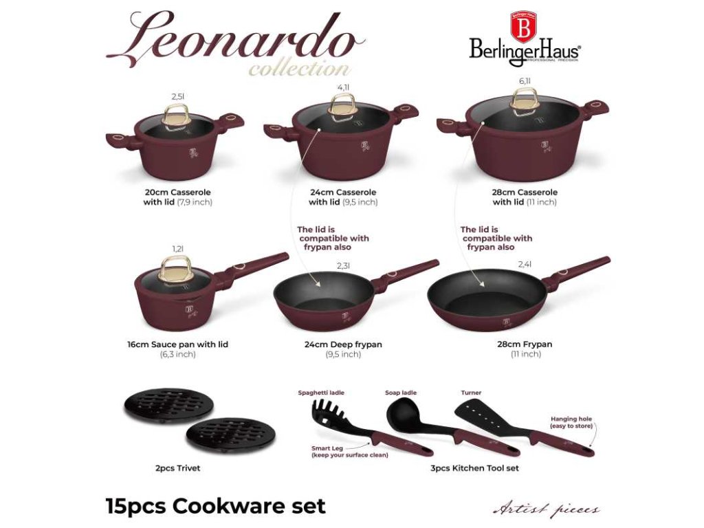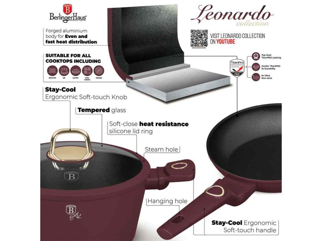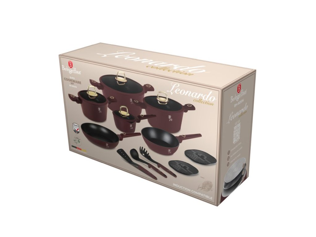 Sada nádobí Berlingerhaus Leonardo Collection s titanovým povrchem nabízí profesionální kvalitu pro každodenní vaření. Kombinuje odolný materiál, rovnoměrné zahřívání a praktické příslušenství v jedné 15dílné sadě.