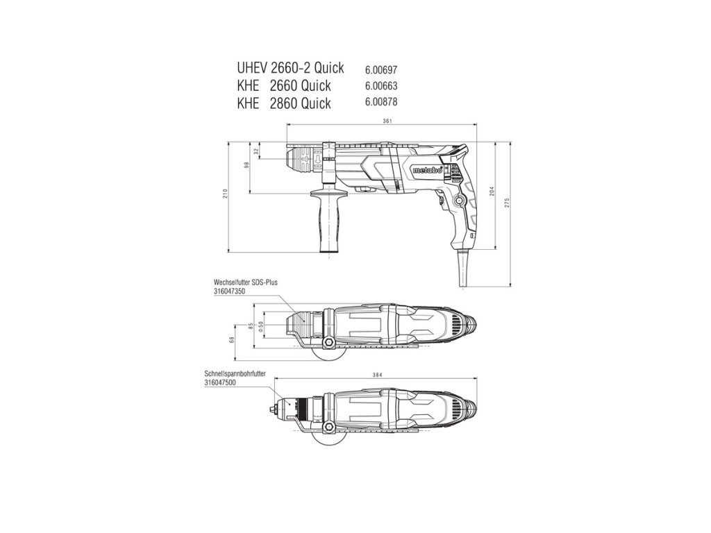 Multifunkční kladivo se 4 funkcemi: Vrtání s příklepem, vrtání ve dvou rychlostech a sekáníMetabo Quick: rychlá výměna příklepového sklíčidla SDS-Plus a rychloupínacího sklíčidla k vrtání do dřeva a kovu