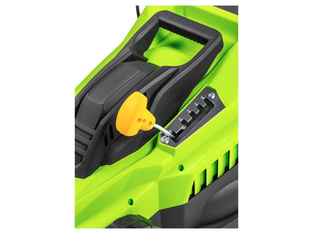 Se záběrem 33 cm, měkčenou rukojetí se spínačem přes celou šířku madla, centrálním nastavením výšky sečení s pěti pozicemi (25–70 mm) díky kterému si jednoduše zvolíte ideální délku trávy, a s výkonem 1400 W si poradí i s hustším porostem.