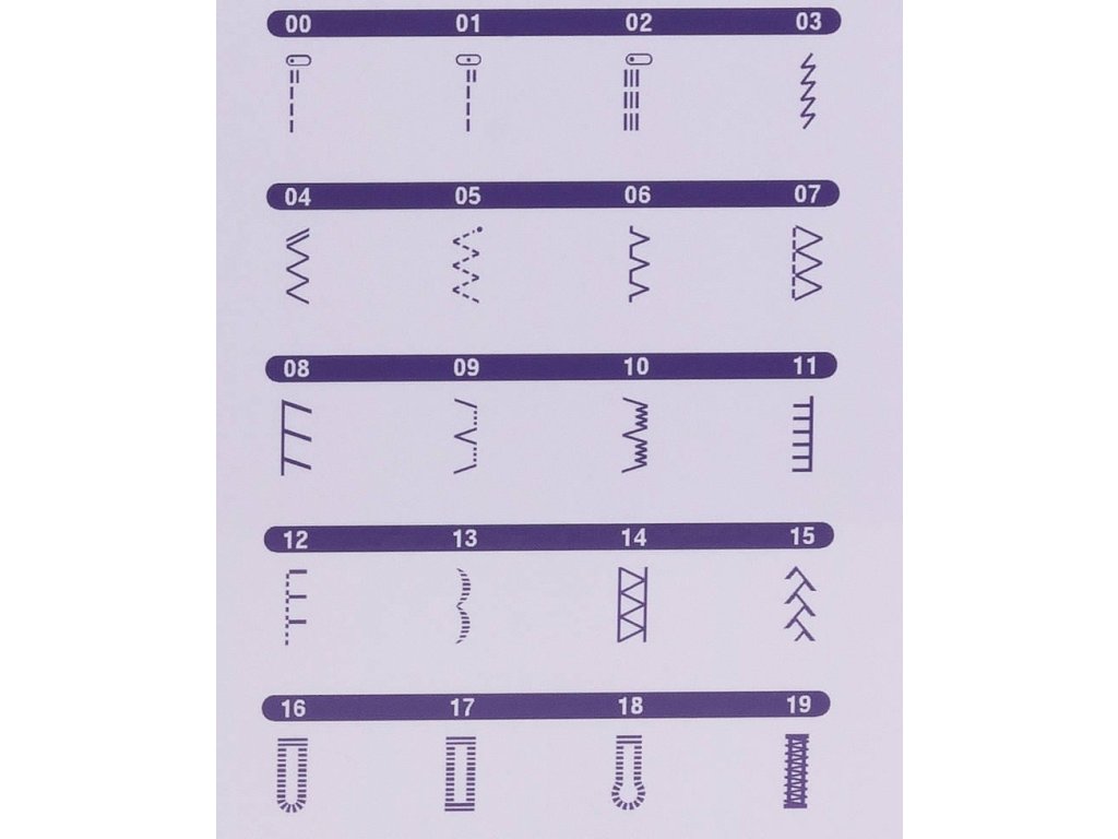Na výběr máte z nabídky 20 druhů stehů, z toho 3 druhy knoflíkové dírky. Stehy nabízí klasické, strečové, overlockové, ozdobné vyšívací, quiltovací i látací.