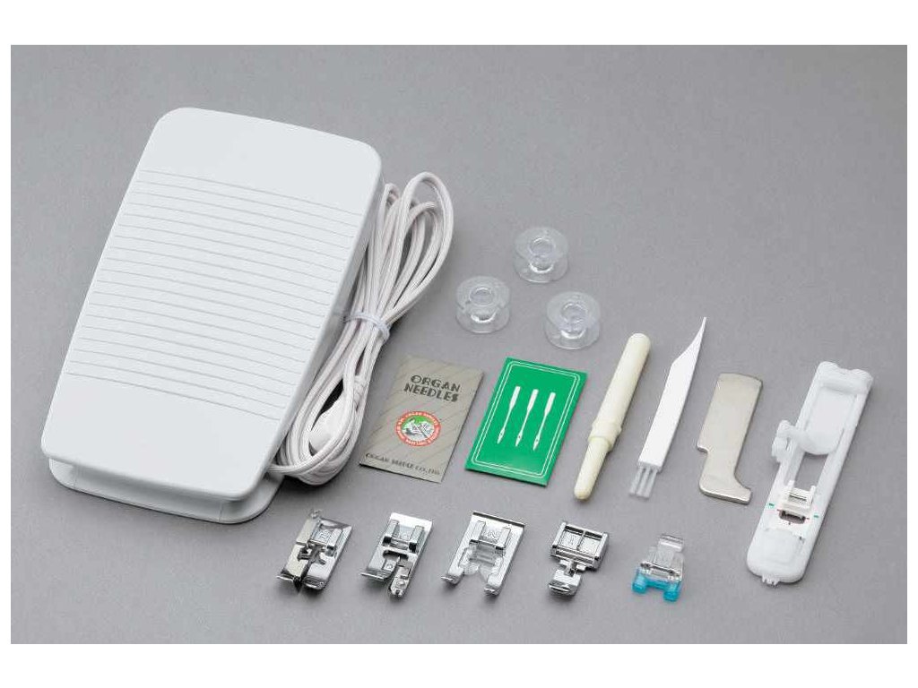 U stroje najdete bohaté příslušenství – 7 patek, se kterými ušijete téměř všechno, náhradní jehly, šroubovák, štěteček, páráček. Navíc dostanete ke stroji měkký kryt proti prachu, samozřejmostí je český návod, pedál a kabel.